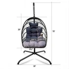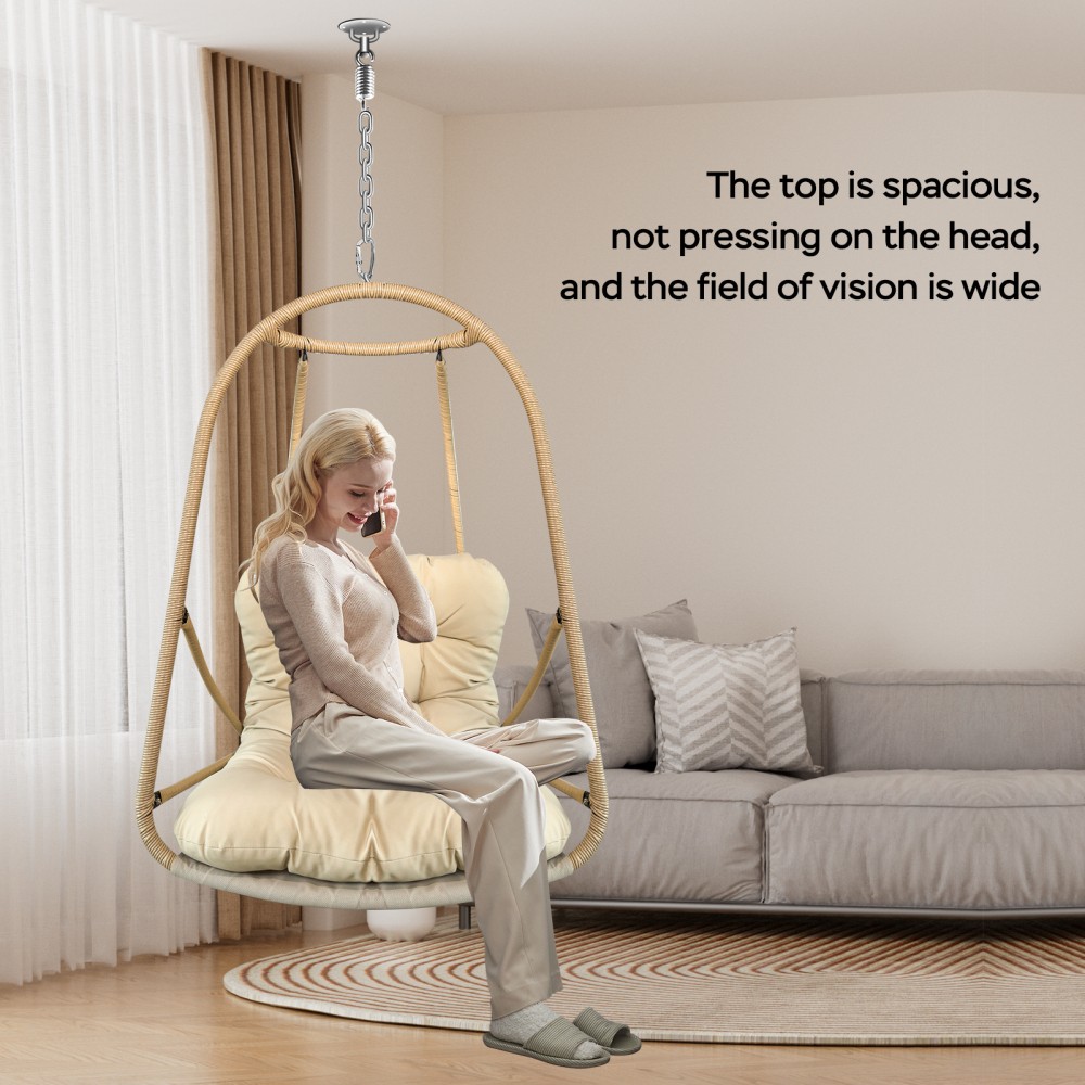 1-Year Warranty & 30-Day Free Return! Shop with confidence knowing your purchase is protected by our hassle-free warranty and return policy. If you have any issues, we've got you covered. Product Dimensions Assembled Length: 38.00 inches Assembled Width: 38.00 inches Assembled Height: 78.00 inches Product Weight: 18.00 lbs Weight Capacity: 350 lbs Packaging Dimensions Length: 43.30 inches Width: 29.50 inches Height: 6.69 inches Package Weight: 22.00 lbs Key Features ✅ Special Design with Built-in Cup Holder Keep your favorite drink within arm's reach with our uniquely designed cup holder. Perfect for enjoying coffee, iced tea, or soda while relaxing—no more balancing cups on nearby surfaces! ✅ Sturdy & Weather-Resistant Construction Crafted with a powder-coated metal frame to prevent rust and corrosion, ensuring long-lasting use both indoors and outdoors. The frame and seat are wrapped in high-quality resin wicker that offers 3-year anti-aging protection against sun, rain, and wind. Equipped with 304 stainless steel hooks and hardware, plus a 4-point support system for maximum safety and reliability. ✅ Ergonomic Comfort & Foldable Design The curved mid-back follows your body's natural shape, providing full-body support. Soft, UV-resistant thick cushion and headrest pillow reduce head and spine pressure, delivering ultimate comfort for hours of relaxation. Foldable design adds safety (prevents unsupervised play by kids) and saves space for storage or transport. ✅ Easy Assembly & Portable Everything you need is included in the box: chair, headrest pillow, seat cushion, safety strap, and all hardware. With the provided tools, one person can assemble this hanging chair in just a few minutes. Lightweight design makes it easy to move between your patio, backyard, living room, or bedroom. ✅ Perfect Gift Choice This stylish and comfortable egg swing chair is an ideal gift for kids, family, or friends on Christmas, New Year, birthdays, or other holidays. It's a great addition to any home or outdoor space! Note: This product does not include a stand. Customization services are available—please contact the seller for specific requirements.