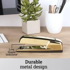This 747 stapler in stylish gold metallic combines reliable performance and modern design. Jam-resistant mechanism delivers accurate stapling. 30 sheet stapling capacity with S.F. 4 Premium Staples. Double coated, die cast, zinc construction for maximum durability. Conveniently opens for tacking so it’s easy to add documents to bulletin boards and walls. Adjustable anvil, the metal piece that goes under the paper when stapling, rotates to create temporary staples for easy removal. Positive locking latch secures staple position. Stapler holds a full strip of 210 staples; 1/4" leg length. 100% Performance Guarantee. Limited lifetime warranty. ICONIC METAL STAPLER – Gold Metallic stapler with all-metal construction is designed for durability. A specially crafted inner rail delivers jam-resistant, accurate stapling you can count on. DESIGNED FOR DESKTOP – The 747 stapler is intended for desktop use. It holds a full strip of 210 staples. The helpful low-staple indicator lets you know when it's time for a refill. SECURES 30 SHEETS – This high-performing stapler fastens up to 30 sheets of paper and works best with standard S.F. 4 Premium Staples. Standard staples have 1/4" length legs. TACKING & PINNING – Tack papers to bulletin boards with ease: unlatch the stapler and you're ready. The stapler can also produce pointed staples for temporary pinning: just reverse the anvil. BUILT TO LAST – stands behind this classy stapler with a 100% performance guarantee and a limited lifetime warranty.