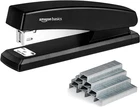Desktop office stapler that holds up to 210 staples. 1000 staples included in the package; the staples have a standard 1/4 inch leg length Can be opened 180° for tacking info to a bulletin board; rotatable anvil provides two stapling models: Temporary Stapling and Permanent Stapling Full rubber base keeps stapler securely in place during use; no skidding or slipping Great for schools, offices, and home for everyday stapling Product Description Amazon Basics Stapler with 1000 Staples, Office Stapler, 25 Sheet Capacity, Non-Slip, Black From the Manufacturer Amazon Basics, This product may originate from VN
