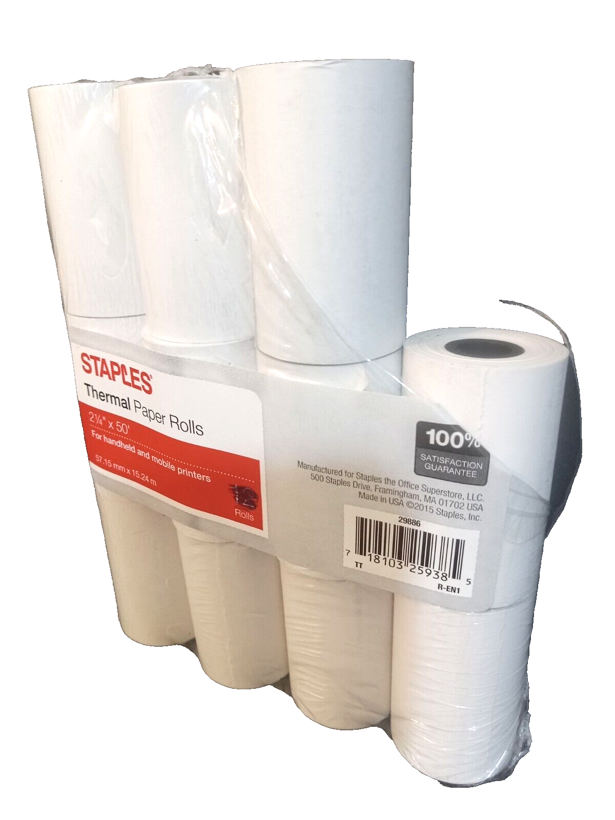 Staples Thermal Paper 2 1/4 x 50 11 Rolls Credit Card POS Cash Register Open *** Item Specifics *** Brand - Staples Condition - New Open Type - Thermal Paper Color - White Size - 2 1/4 x 50 Material - Paper Style - Traditional Gender - Unisex Adults Pattern - Solid Made In - USA Vintage - No Width - 2 1/4 x 50 PLEASE READ CAREFULLY !!! *** All Photo's Are Of The Actual Item(s) That You Will Receive Guaranteed *** *** Please Inspect Your Items That You Receive To Assure That They Arrived Safely *** We Ship From The U.S ***(1 Or Same Day Handling Time) If Item(s) Are Purchased On Or Before 1 PM EST Your Item(s) Will Be Shipped The Same Day Of Purchase.. We Offer FREE 30 Day Money Back Guarantee Returns On All Items . Thank You For Stopping By And Have A Great Day !!