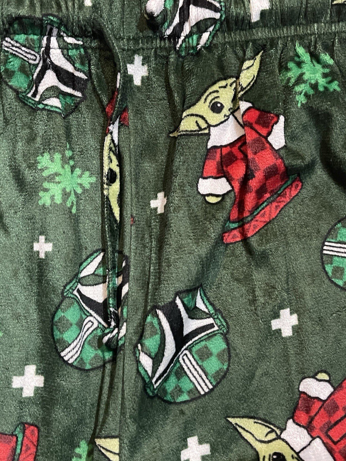 These Star Wars Baby Yoda and Boba Fett Christmas pajama bottoms in size Large are perfect for any fan of the iconic franchise. The green pants feature a festive Christmas theme, making them a fun and cozy addition to your sleepwear collection. Made by the Star Wars brand, these pajama pants are designed for women and are a great way to show off your love for the galaxy far, far away.