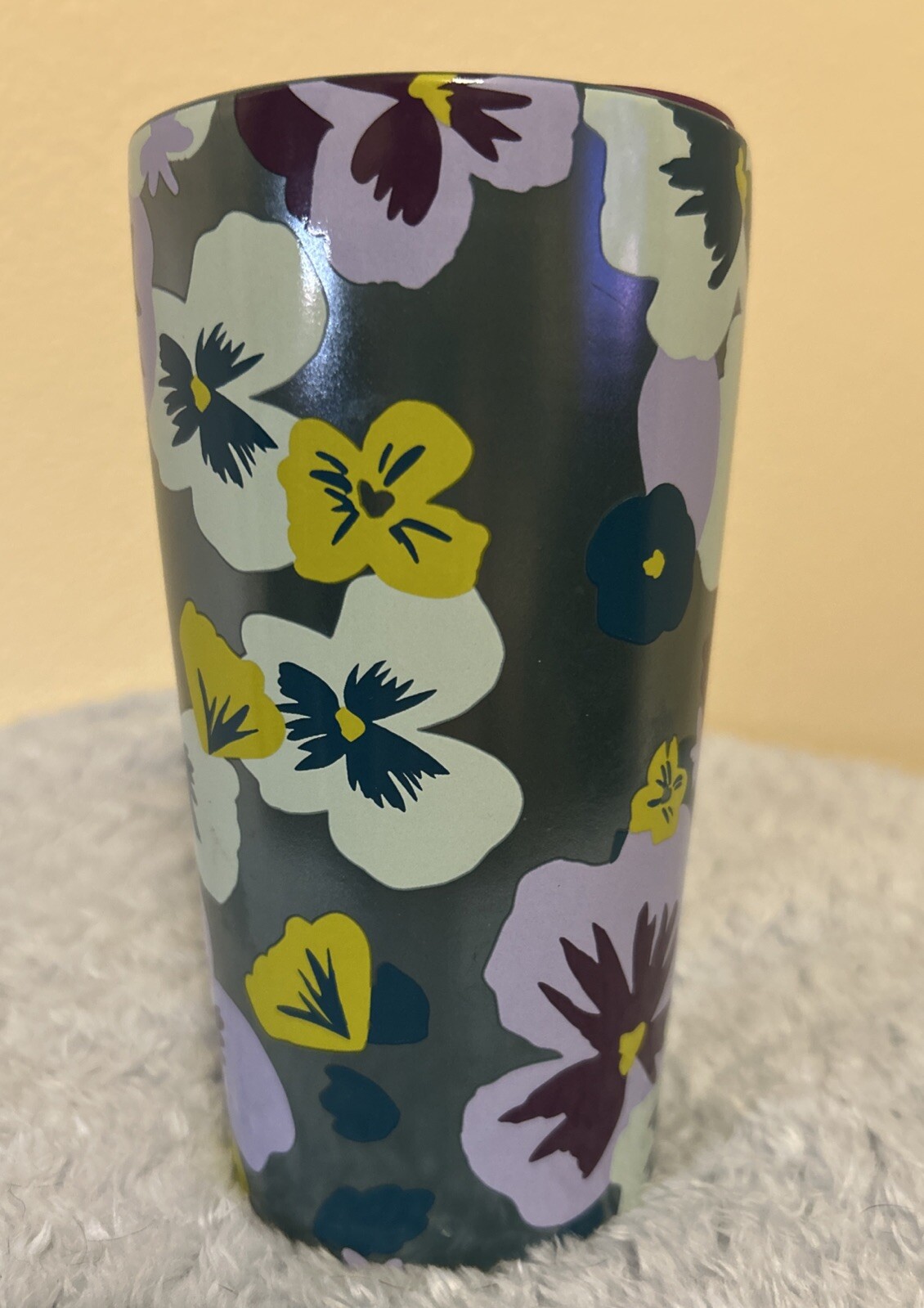 This stunning Starbucks travel mug features a beautiful lilac and green pansy design, perfect for coffee and tea lovers alike. With a 12oz capacity, it's great for on-the-go use, and its double wall ceramic construction ensures your beverage stays hot or cold for longer. This original 2020 creation is a must-have for any Starbucks collector or fan, and is made in China with careful attention to detail. The California Prop 65 Warning does not apply to this item.