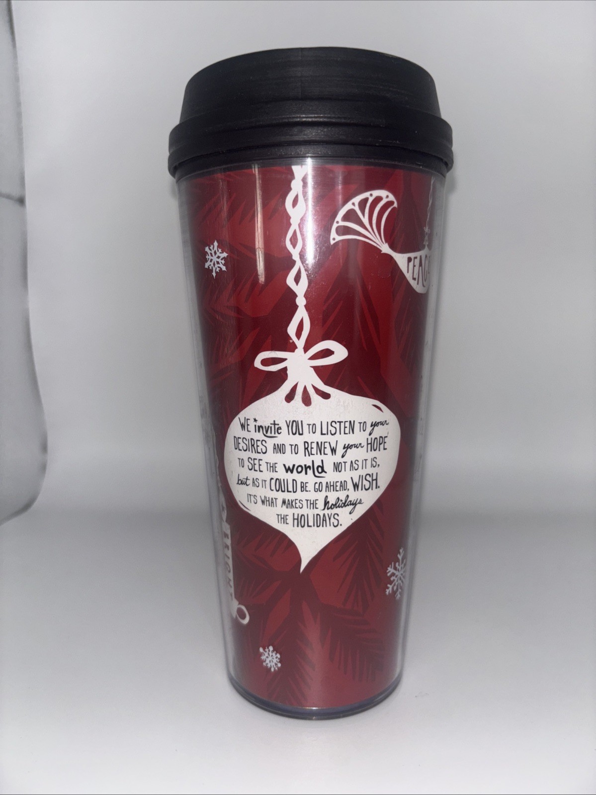 The product is a Starbucks Coffee Travel Mug with a 16 oz capacity, featuring a festive red color and the Starbucks logo. This limited edition tumbler cup was created in 2009, making it a unique collectible item for coffee enthusiasts. Made in China, this original Starbucks cup captures the theme of coffee and tea, perfect for those who appreciate the brand's iconic advertising and design. It would make a great addition to any Starbucks or coffee memorabilia collection.
