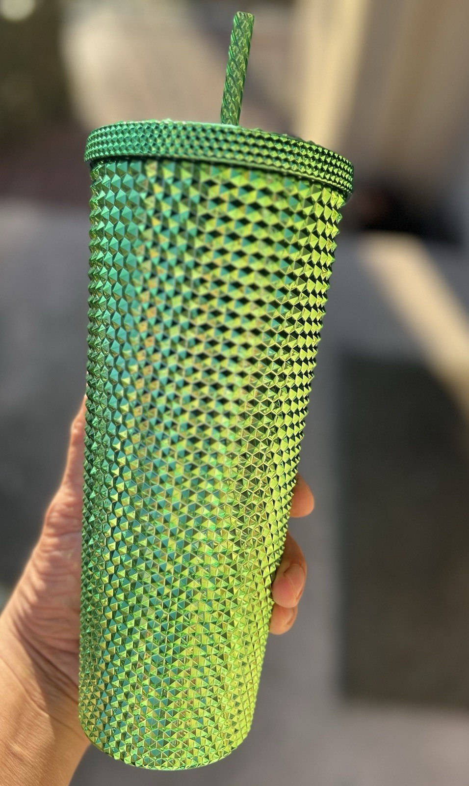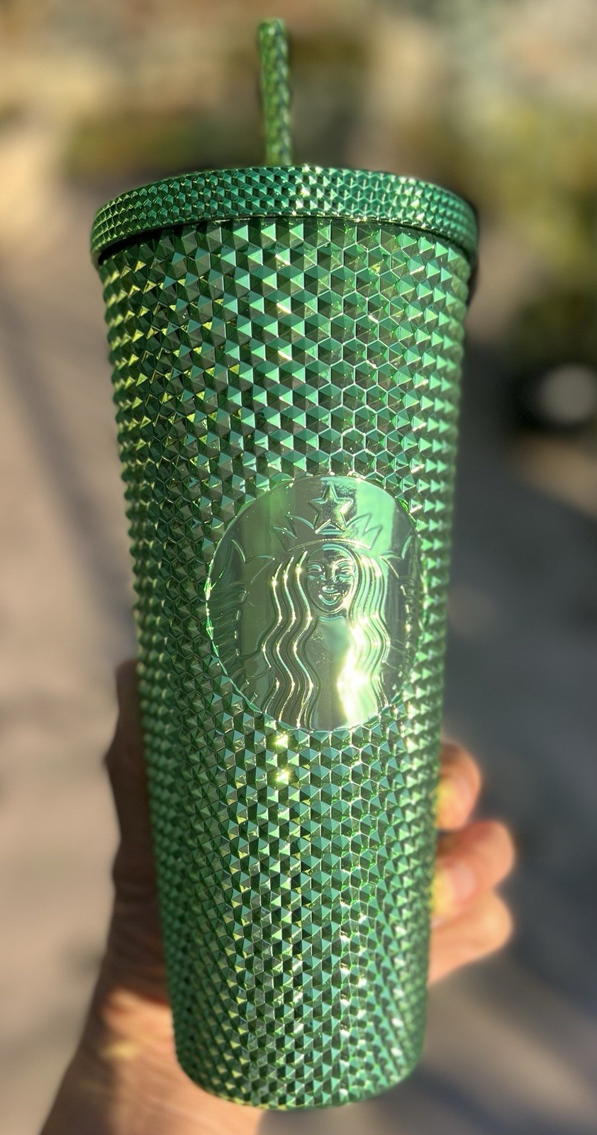 The product is a new Starbucks Metallic Green Studded Cold Cup Tumbler with Straw Diamonds in a 24oz size. This tumbler is part of Starbucks' advertising campaign for coffee and tea, featuring a unique green color and studded design. Manufactured in China, this original tumbler from 2023 does not have any California Prop 65 Warning. Perfect for on-the-go beverages, this tumbler combines style and functionality with the iconic Starbucks brand.