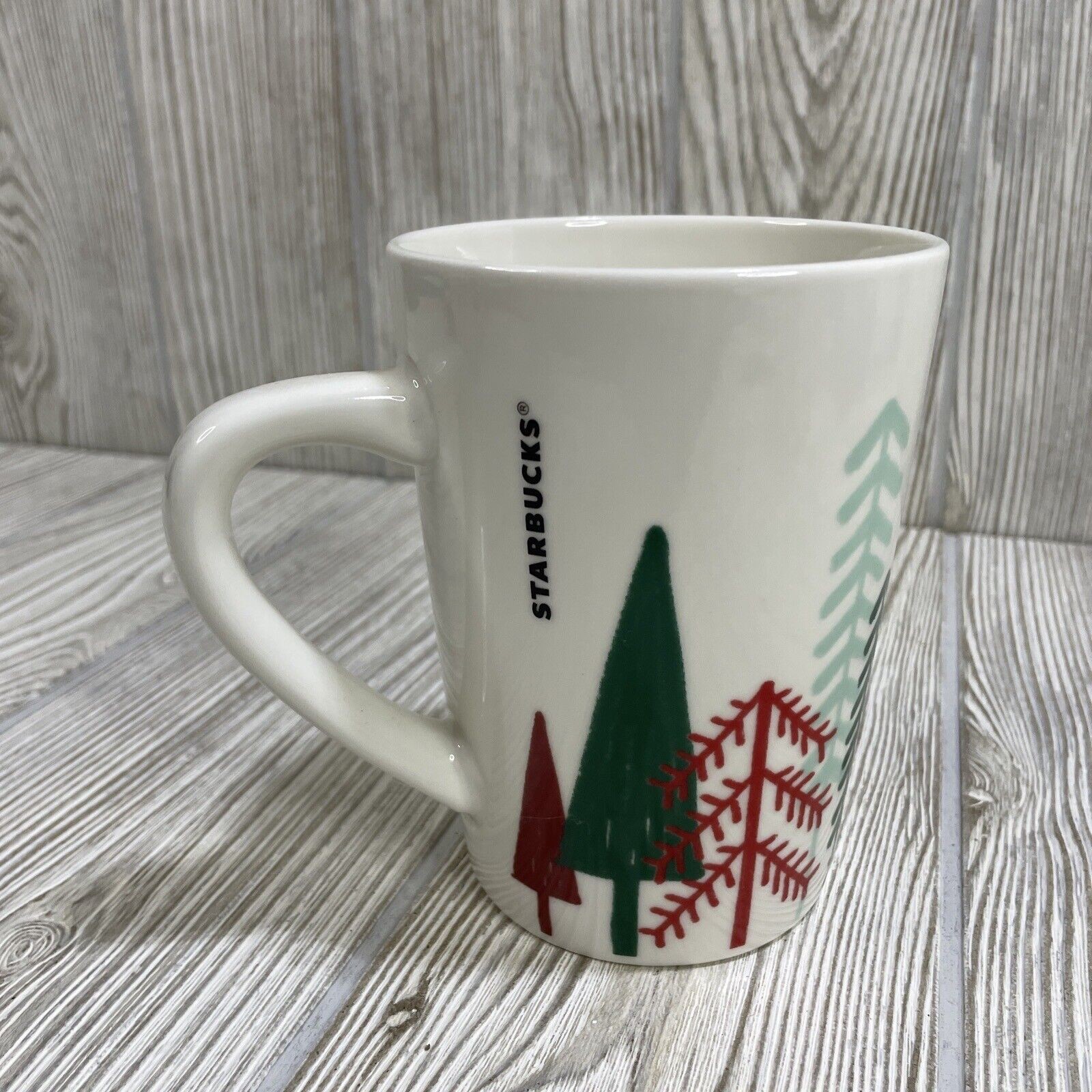 For sale is this Starbucks Christmas Holiday Coffee Mug Cup. White, featuring Green & Red Trees. Holds 14.4 fl oz. Good condition, see photos.