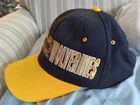 Show off your love for the Michigan Wolverines with this vintage Starter snapback cap. Made from 100% wool in a solid blue color with a twill fabric type, this adjustable hat features the iconic Wolverines logo and is perfect for travel, casual wear, or even work. The breathable design makes it suitable for all seasons, whether it's winter, summer, fall, or spring. This hat is a must-have for any University of Michigan or 90s sports fan, and with its adjustable size, it's suitable for both men and women. Manufactured in the Dominican Republic in the 1990s, this vintage hat is a rare find for any collector. Loose thread and pilings as shown.