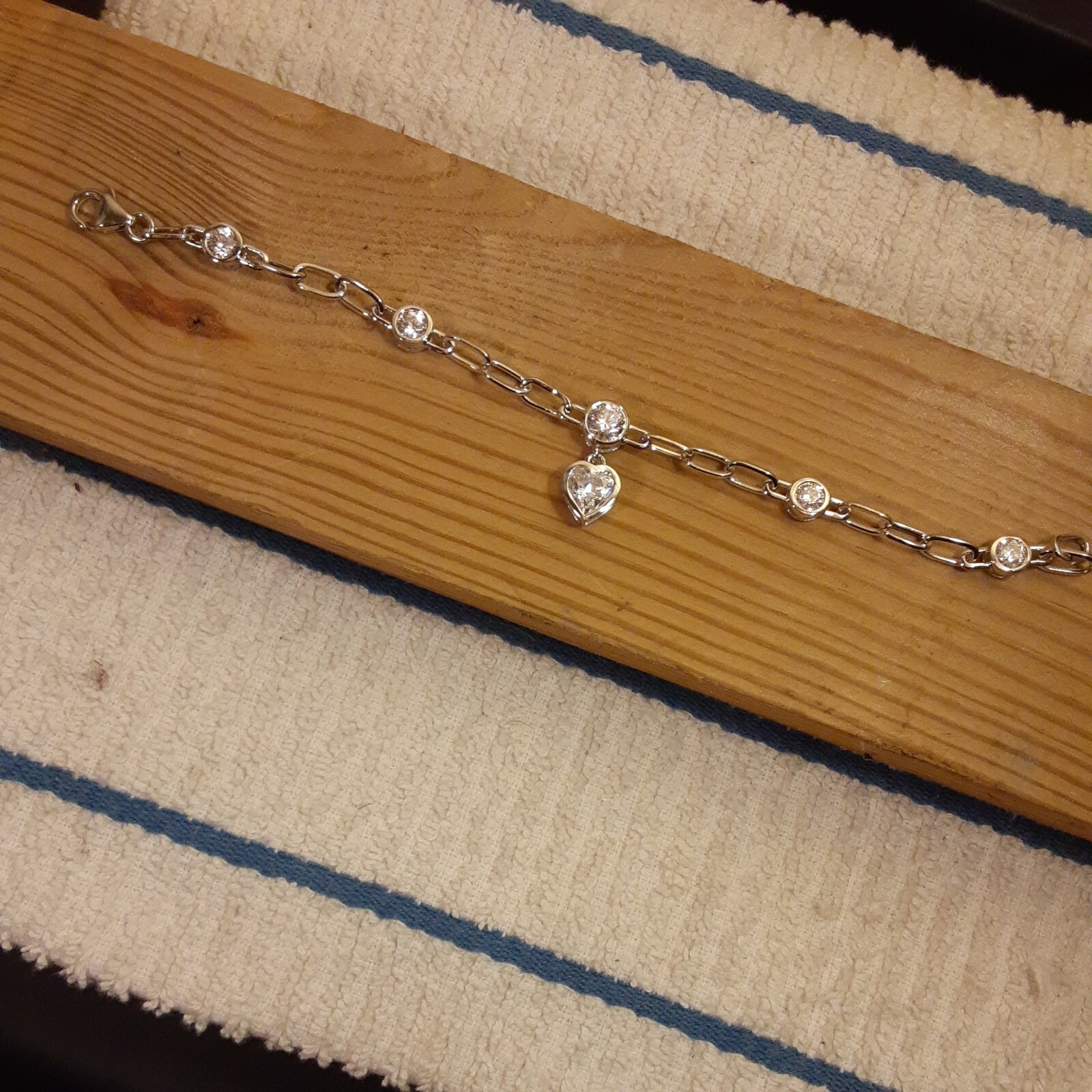 Platinum Over Sterling Silver Heart Charm Bracelet (8.0 Inches) Made With White Color Zirconia From Swarovski (3.80 TCW) GEM 1 # of Round World's Finest Zirconia Zirconia : 1 Minimum TCW : 1.0 Minimum Size : 5.5 mm GEM 2 # of Heart Shaped World's Zirconia : 1 Minimum TCW : 2.20 Minimum Size : 7 mm GEM 3 # of Round World's Finest Zirconia : 4 Minimum TCW : 0.60 Minimum Size : 4.5 mm ALL GEMS Average Color : White/Colorless Average Clarity : Transparent Hardness : 6-7 Enhancement : Precise Laser Cutting and Coating Setting Type : Bezel Settings on all Stones Free Shipping (456)