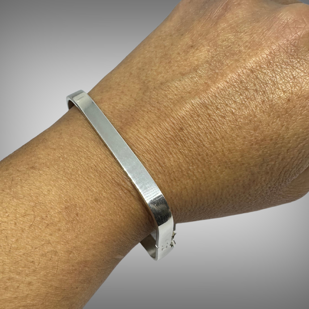 This beautiful bangle bracelet is crafted in sterling silver 925, making it a stunning addition to any jewellery collection. The box closure ensures a secure and comfortable fit. The bangle style is perfect for both casual and formal occasions, and the silver colour adds a touch of elegance to any outfit. Made in Italy, with 925 Italian stamp this bracelet is of the highest quality and is sure to impress. width 5.8mm inner diameter 58.77mm Gift box included Sb23