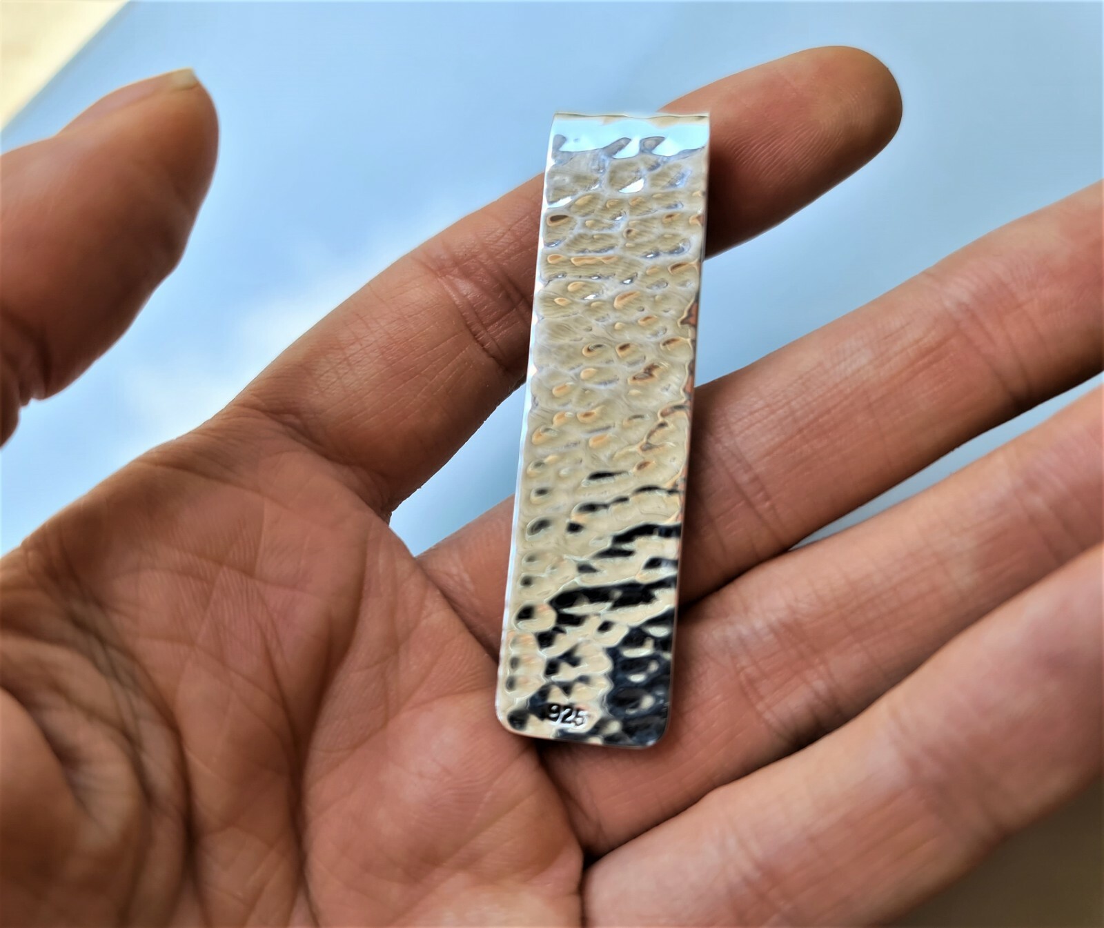 Hammered Silver Money Clip Pure .925 Sterling Silver Money Clip This beautiful Money Clip is handmade and has been Fabulously casted with .925 Sterling Silver The weight is 18 GRAMS The Length is 60 mm The Width is 15 mm We offer laser engraving on all our jewelry for 3$ per letter and or 10$ per your personal logo. Please allow 2-3 weeks shipping as we are in Bangkok Thailand at this time We are a Los Angeles based company operating out of Thailand so that we may bring you the highest quality items at the most competitive prices. Just search and compare. We only offer authentic items. What we describe in our listings is 100% accurate and we encourage all of our customers to authenticate their purchases. USA please allow 15-20 business days Europe and U.K please allow 15-20 business days Canada please allow 25-30 business days Hawaii please allow 5-10 business days