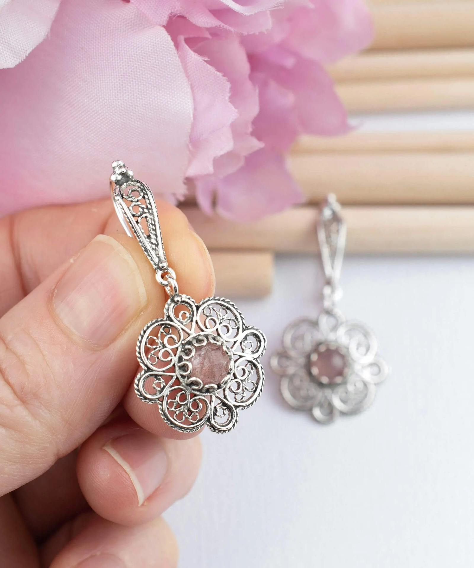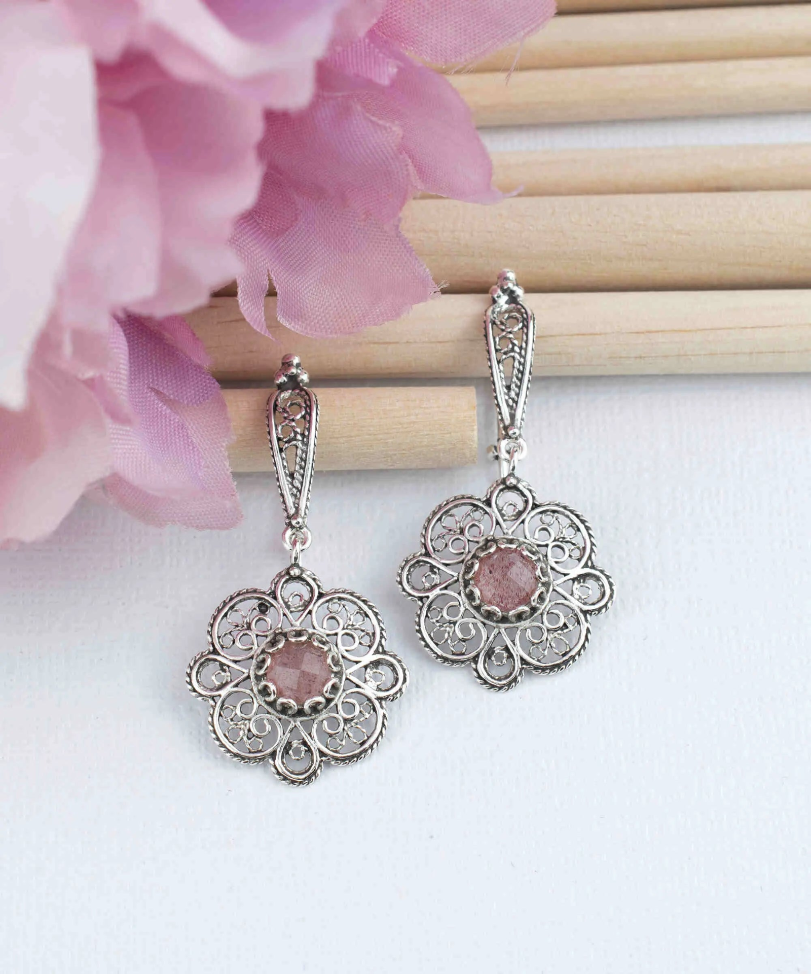 Introducing the Handmade 925 Sterling Silver Filigree Art Cherry Quartz Gemstone Sun Figured Women Dangle Drop Earrings, a stunning and unique piece of jewelry that is sure to impress. These earrings are crafted by skilled artisans with intricate filigree art in a sun figure pattern and made with high-quality 925 sterling silver. The striking sun figure design and intricate filigree work add sophistication and elegance to the earrings, while the dangle drop design adds movement and dimension. The Cherry Quartz gemstone is carefully selected for its quality and color, and the faceted cut gives it a shiny appearance that complements the filigree design. The combination of the Cherry Quartz gemstone and filigree art creates a one-of-a-kind look that is both eye-catching and unique. The earrings are both oxidized and highly polished, giving them a unique and striking appearance. The oxidized finish brings out the details in the filigree design, while the highly polished silver adds a touch of shine. These earrings come with a silver polish cloth, velvet pouch, and a luxurious gift box, making them a perfect gift option for special occasions. The earrings have a length of 1.60 inches, a drop length of 0.80 inches, and a width of 0.80 inches. The Cherry Quartz Gemstone is a 6 mm round, double side faceted rose cut. Filigree is made of delicate metal strands that have been skillfully fashioned to create an outstanding combination of old and modern art, originating in Mesopotamia, Anatolia. Make a statement and add a unique piece to your jewelry collection with the Handmade 925 Sterling Silver Filigree Art Cherry Quartz Gemstone Sun Figured Women Dangle Drop Earrings.