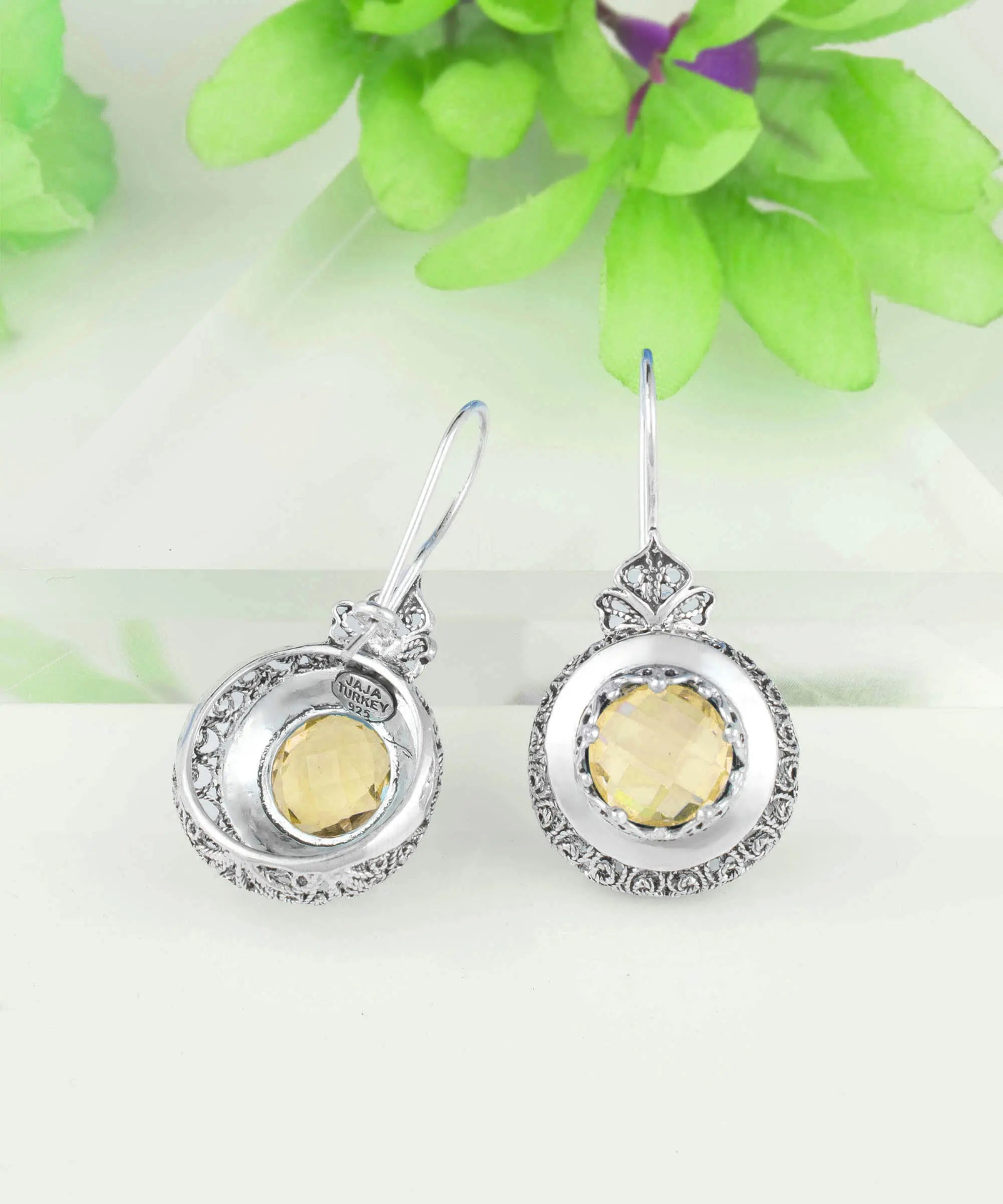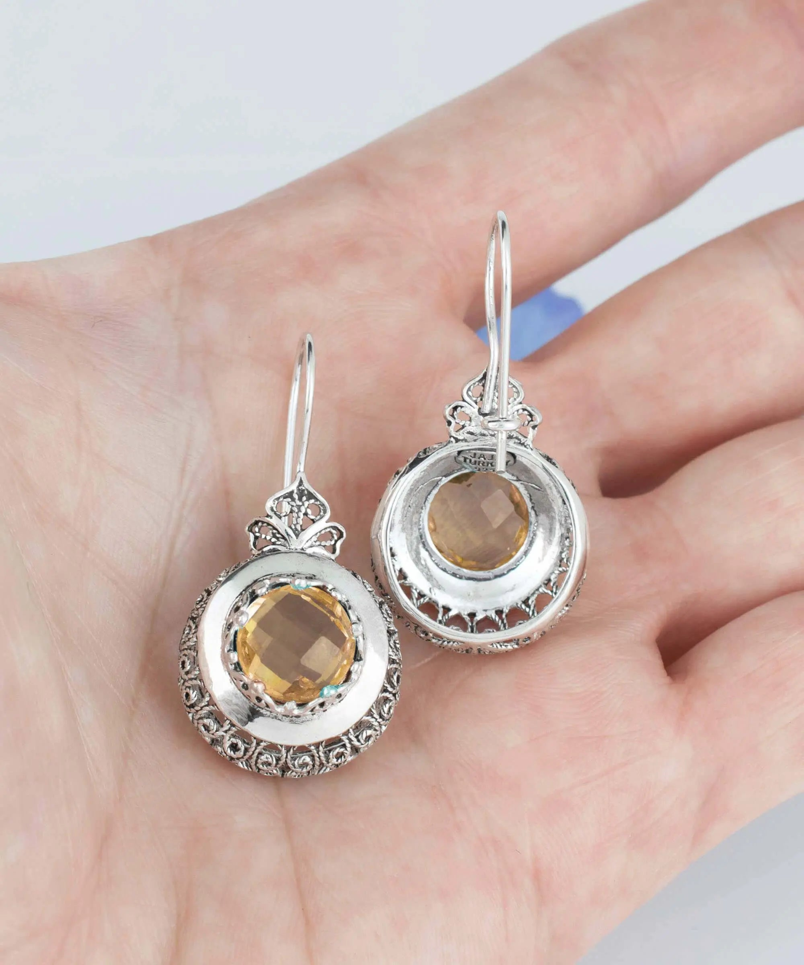 Add a touch of warmth and radiance to your look with these exquisite filigree art drop earrings featuring a beautiful citrine gemstone, the November birthstone. These earrings are crafted from high-quality 925 sterling silver and are expertly oxidized and highly polished to achieve a unique and sophisticated appearance. The warm and sunny tones of the citrine gemstone create a dazzling display of light, making these earrings a perfect choice for any occasion. The intricate filigree art design showcases the skillful craftsmanship and attention to detail that went into creating these earrings, and they come with a silver polish cloth, velvet pouch, and a gift box for a luxurious presentation. Whether you're looking to celebrate a November birthday or simply add a touch of elegance to your style, these earrings are sure to impress. They make a thoughtful and meaningful gift for yourself or your loved one, and are a timeless addition to any jewelry collection. The earring's length: 1.60 Inches; Width: 0.75 Inches Citrine gemstone is 10.00 mm double-side faceted, checkerboard round-cut. Filigree is made of delicate metal strands that have been skillfully fashioned to create an outstanding combination of old and modern art. Originating in Mesopotamia, Anatolia.