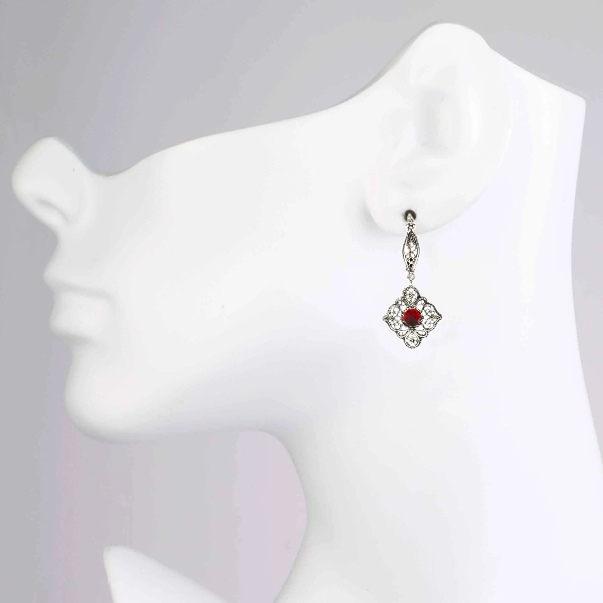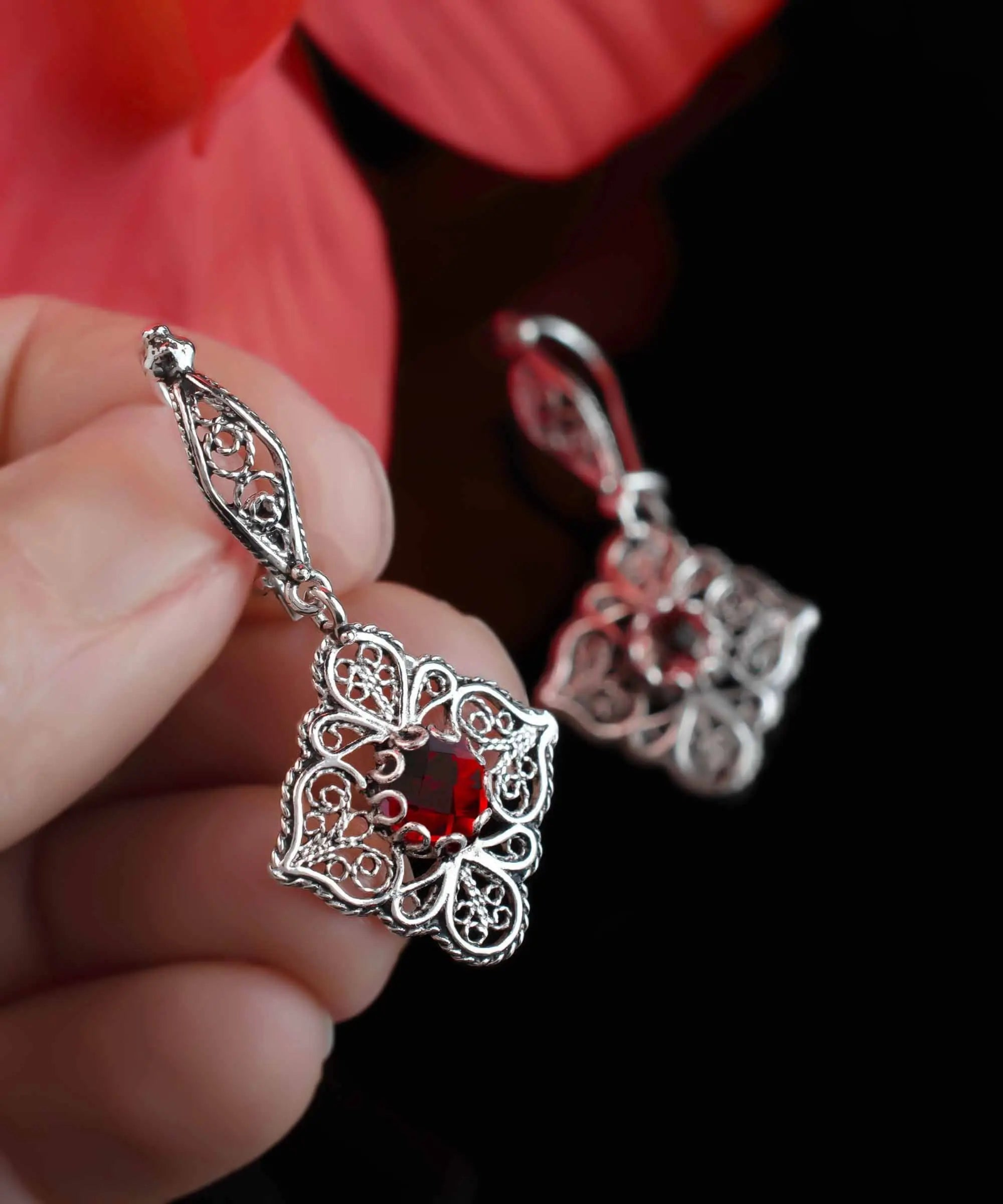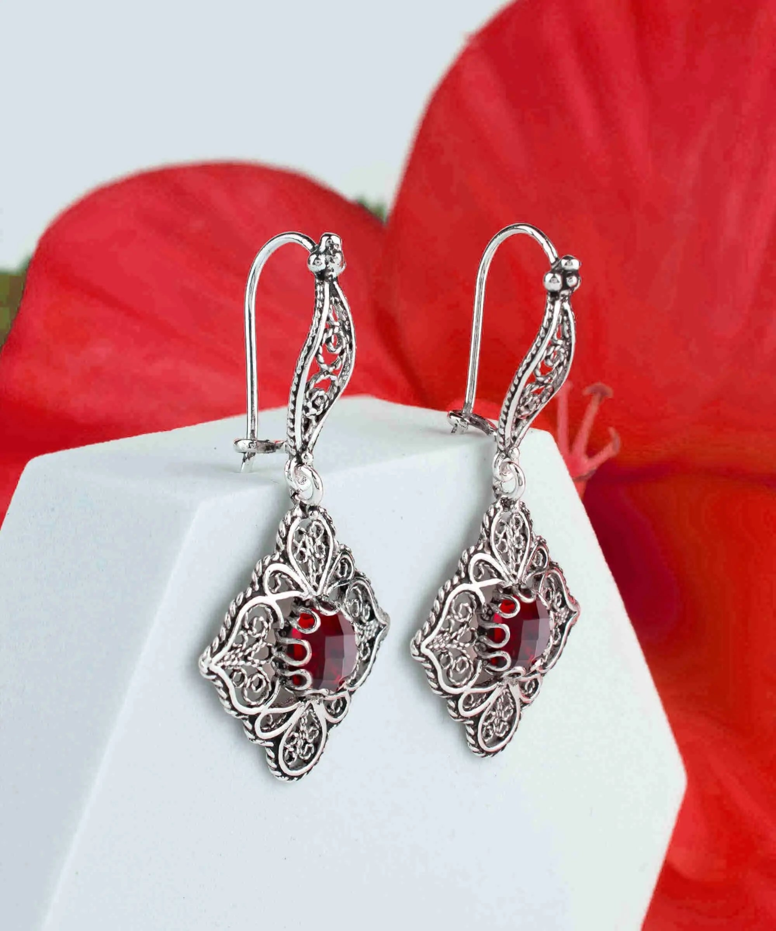 Introducing our stunning 925 sterling silver handcrafted filigree art ruby gemstone women's dangle drop earrings, a truly unique piece of jewelry. Made from high-quality, durable sterling silver, these earrings feature intricate filigree art in a timeless design. Adorned with gorgeous ruby gemstones, these earrings are the perfect gift for those born in July or anyone who loves a pop of red. Carefully selected for their quality and color, the faceted round cut of the ruby gemstones adds a touch of elegance to the overall design. The earrings are both oxidized and highly polished, giving them a one-of-a-kind appearance. The oxidized finish brings out the details in the filigree design, while the highly polished silver adds a touch of shine and sophistication. These earrings come with a silver polish cloth, velvet pouch, and a luxurious gift box, making them the perfect gift for any special occasion. Whether you're looking to treat yourself or a loved one, these earrings are sure to make a statement. The earrings measure 1.60 inches in length and 0.80 inches in width. Don't miss out on the chance to add these stunning sterling silver filigree art ruby gemstone women's dangle drop earrings to your jewelry collection.