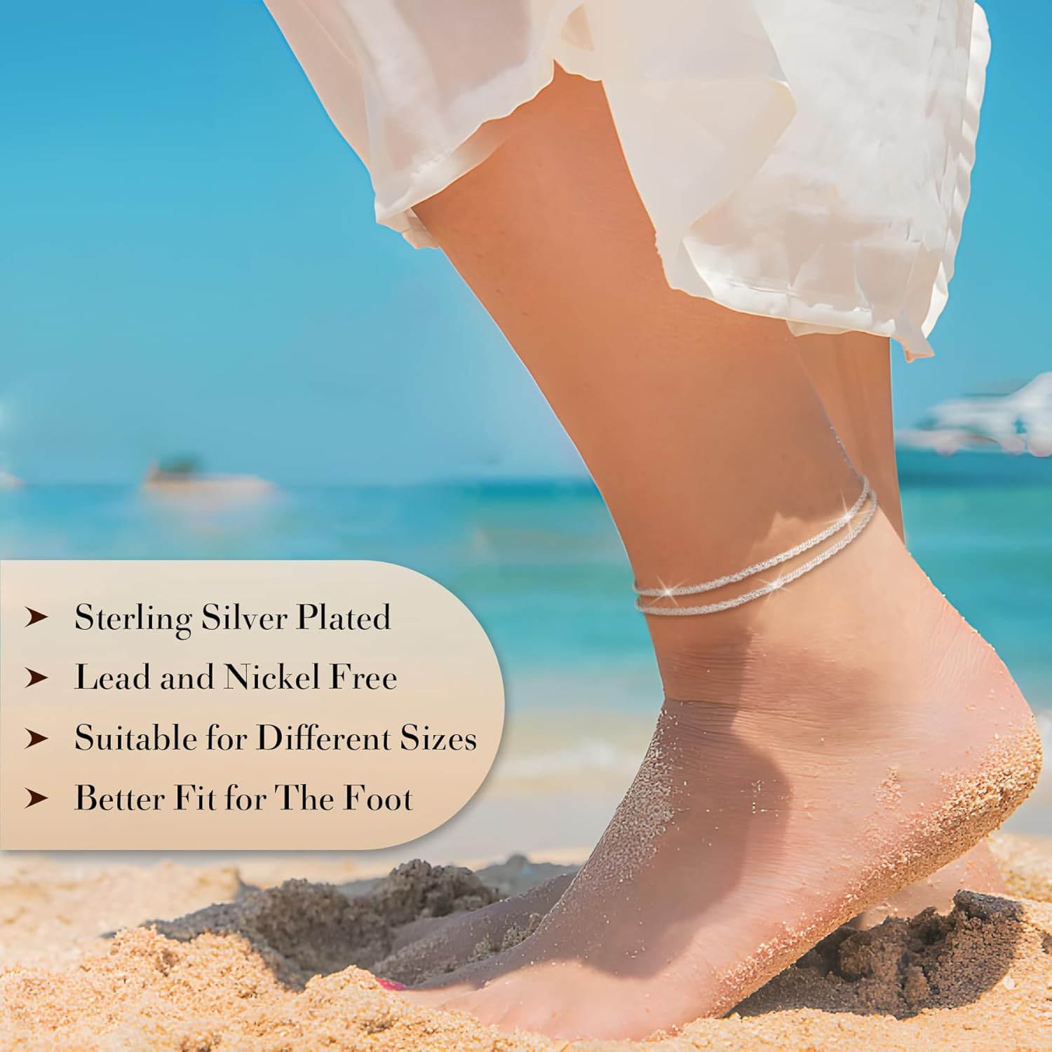 Menu Other Items Feedbacks About Us Contact Us Add To Favorites Sterling Silver Ankle Bracelets for Women,Gold Dainty Layered Waterproof Anklet for Women Adjustable, Womens Anklet Set Stackable plus Size Sterling Silver anklets for women One order you can get 2 Pcs Sterling Silver anklets for women , you will have variety of ways to dress up yourself. To wear one or more as you want. If you like changing, you can also wear different anklets every day. After you get them,welcome to show your favourite collocations, let more customers feel different fashion. SIZE Anklets length 18.5”+ 2.5” extender , Flexible and Considerate design, convenient to adjust, no worry about size problem. MATERIAL These silver bracelet set are made of high quality brass with AAA+ cubic zirconia, S925 sterling silver plated , safe product give you a better wearing experience. PERFECT GIFT The set of Anklets is good for both women and girls. Comes with beautiful gift bag. Best choice for birthday, anniversary, holidays, stocking stuffers, graduation, and any other occasion. Item Specification Metal stamp 925 Chain Rope Chain Gem Type no gemstone Color Silver chain Product Dimensions 0.39 x 0.39 x 0.39 inches Material 银 Metal Silver Department womens Clasp Lobster Claw SHIPPING FREE FAST SHIPPING FREE SHIPPING We are always working hard to ensure your package arrives as soon as possible. Please understand that some factors like weather, high postal traffic, and the performance of shipping companies are outside of our control. We offer free shipping to the lower 48 states. We do not accept P.O. Boxes. Please provide a physical address. If you have a problem or question regarding your transaction please contact us immediately. We will work with you to resolve any problem you may have. Thank you
