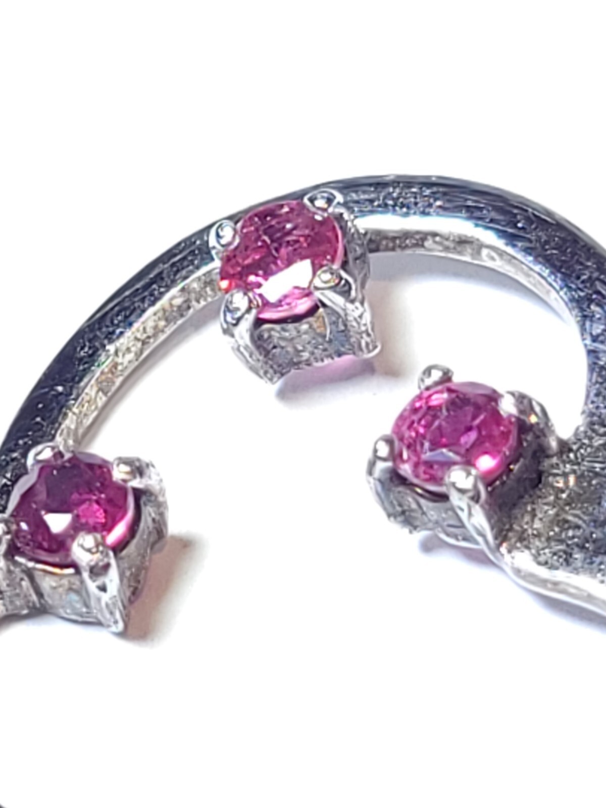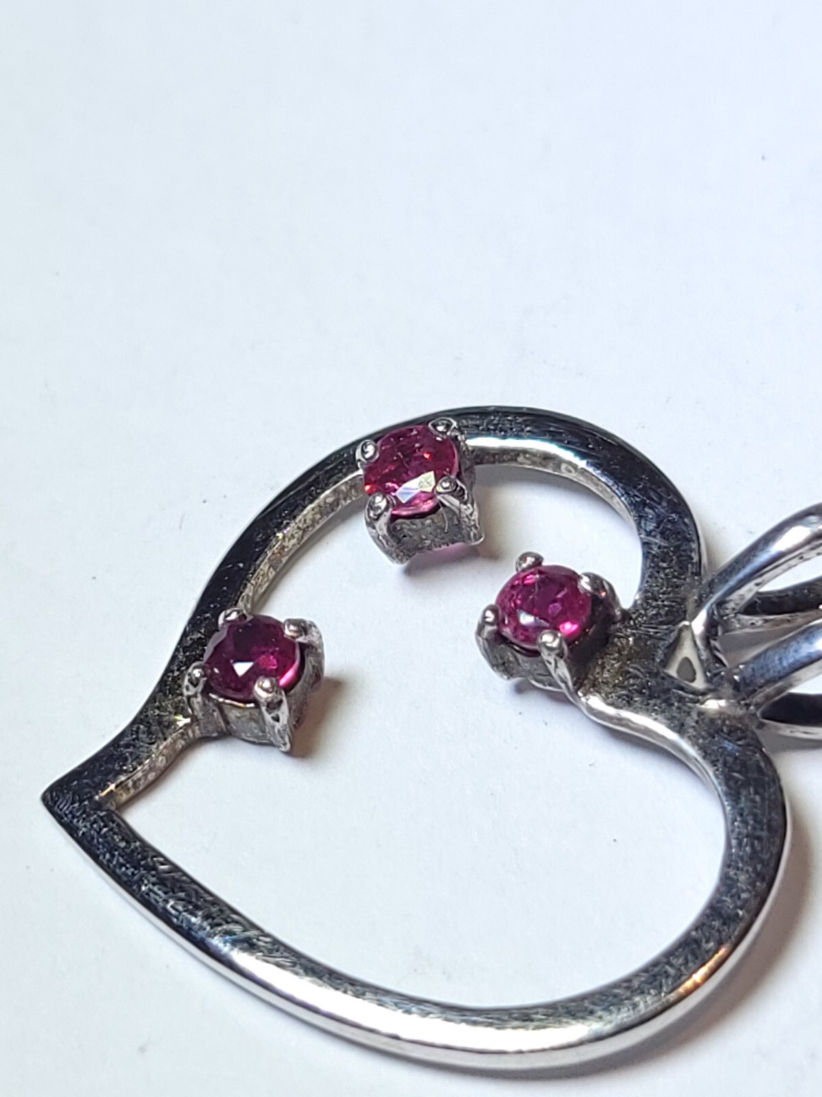 This Sterling Silver Open Heart Pendant features three pink gemstones prong-set within the design. The pendant showcases a wide bail for easy attachment to a chain or necklace. The overall style is elegant and romantic, making it a perfect accessory for adding a pop of color to any outfit. Crafted from 925 sterling silver, this pendant is a versatile and timeless piece that can be worn for various occasions.