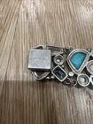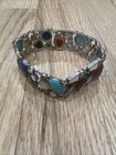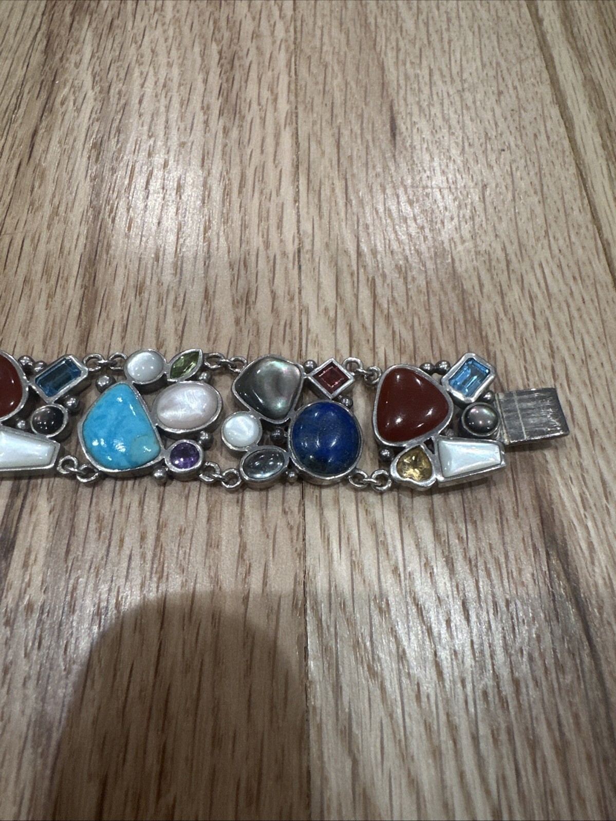 Beautiful artisan-made sterling silver bracelet set with a variety of natural gemstones. This piece features turquoise, lapis lazuli, red jasper/carnelian, moonstone, pearls, citrine, amethyst, smoky quartz, and labradorite. Each stone is bezel-set in solid silver with intricate handcrafted details. 🔹 Details • Metal: Sterling silver 925 • Stones: Turquoise, lapis, moonstone, pearl, citrine, amethyst, jasper, labradorite & others • Style: Boho / artisan / handcrafted • Closure: Box clasp (or lobster—confirm if needed) 🔹 Condition • Pre-owned • No missing stones • Strong clasp • Light wear consistent with age 🔹 Notes This is a high-quality natural gemstone bracelet with vibrant colors and a unique handmade design. Perfect for collectors of boho, ethnic, or artisan silver jewelry.