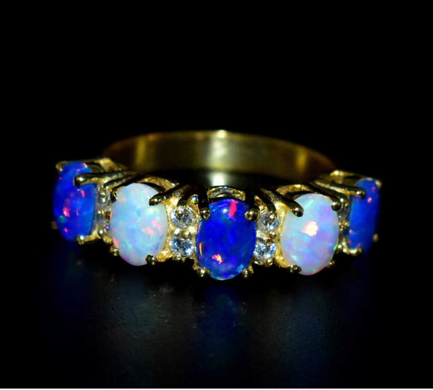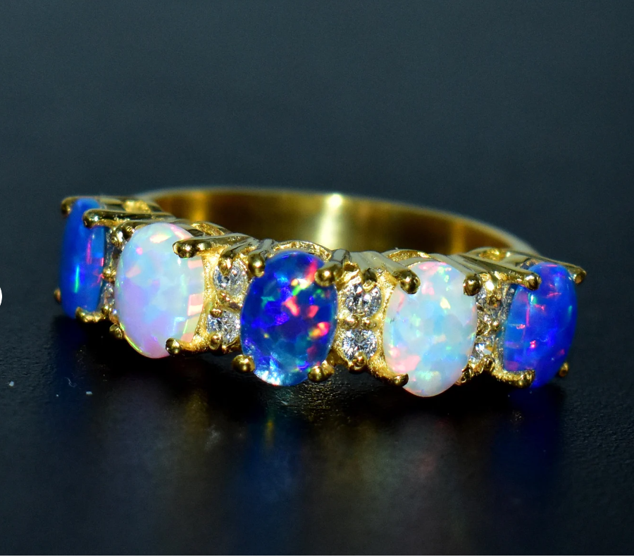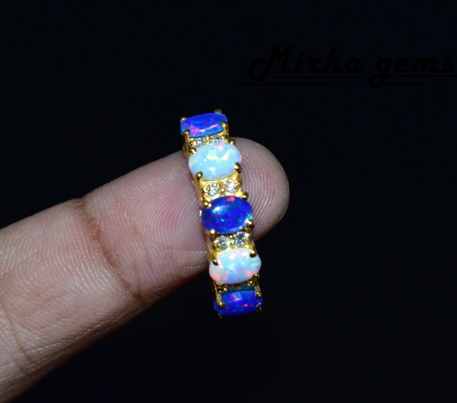 PRODUCT DESCRIPTION Engagement Opal Band Sterling Silver Wedding Band Created Opal Ring Silver Ring. Specification: Stone Name- Opal Stone Size - 6x4 mm Stone Shape Oval Shape Stone Cut - Cabochon Stone Weight -3.00Cts (Approx.) Stone Color- White and Blue Birthstone Month- October Metal- 925 Sterling Silver Finished With Rhodium Method- Cast Personalization- Possible Occasion- Engagement Stone Style- Seven Stone Ring Size: We make rings from US 4 to US 16. (If you need smaller or bigger ring size, please ask me to resize) PAYMENT METHODS We accept Payoneer and the rest other modes of payment are also accepted. It is easy and safe for you to pay by credit cards, debit cards, bank transfers, and Payoneer account balances. Payment should be made within 2 days after the winning of the item. SHIPPING POLICY US shipping - Free Shipping International-Free Shipping Each item is individually packed securely with quality products to help ensure safe and undamaged delivery. We ship within 1 business day after payment is received. Delivery is generally within 10-15 days worldwide after shipping. In rare cases, it makes take up to 2-3 weeks for delivery depending upon the destinations and customs regulations in your country. All packages have a duly filled customs declaration form to avoid any delay in customs. RETURN POLICY Your satisfaction is of the utmost concern to us. Should you need to return an item, you can do so within 30 days of receipt of the item for a full refund. Return shipping charges are not reimbursable. All items must be in their original condition, not worn or altered. Please contact us if you would like to initiate a return, so that we may guide you through the process. We can be reached through the "Ask a Question" link on the listings. FEEDBACK We strive for 100% Customer Satisfaction and we always leave positive feedback to our buyers. Please help us maintain our business and give us a 5-Star rating. If you still think that you still can?t leave a 5-Star across the Board, please email us or call us and we assure you that your issue will be resolved immediately. We believe in solving the issues. Positive feedback represents our service, product quality, and dedication to customer satisfaction. Our future business depends on your satisfaction or positive feedback with a "5-star rating". Thank you !!