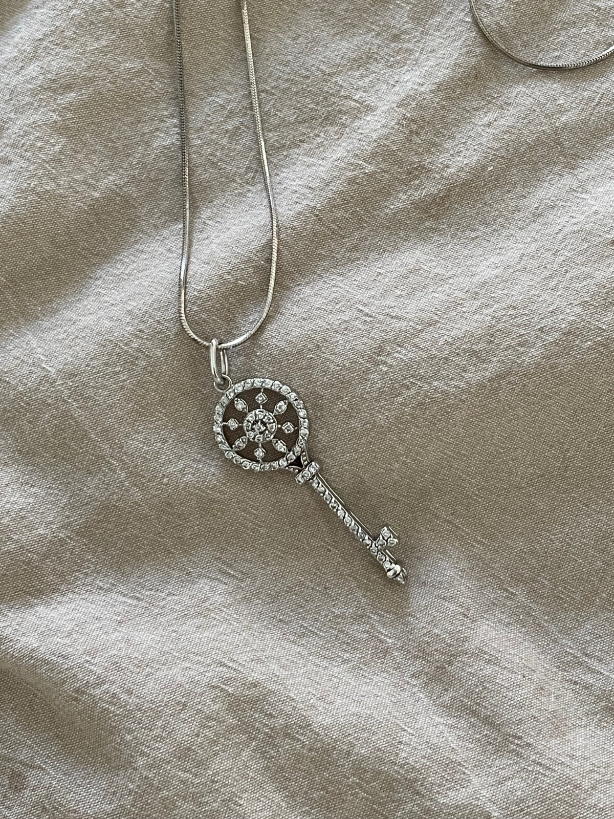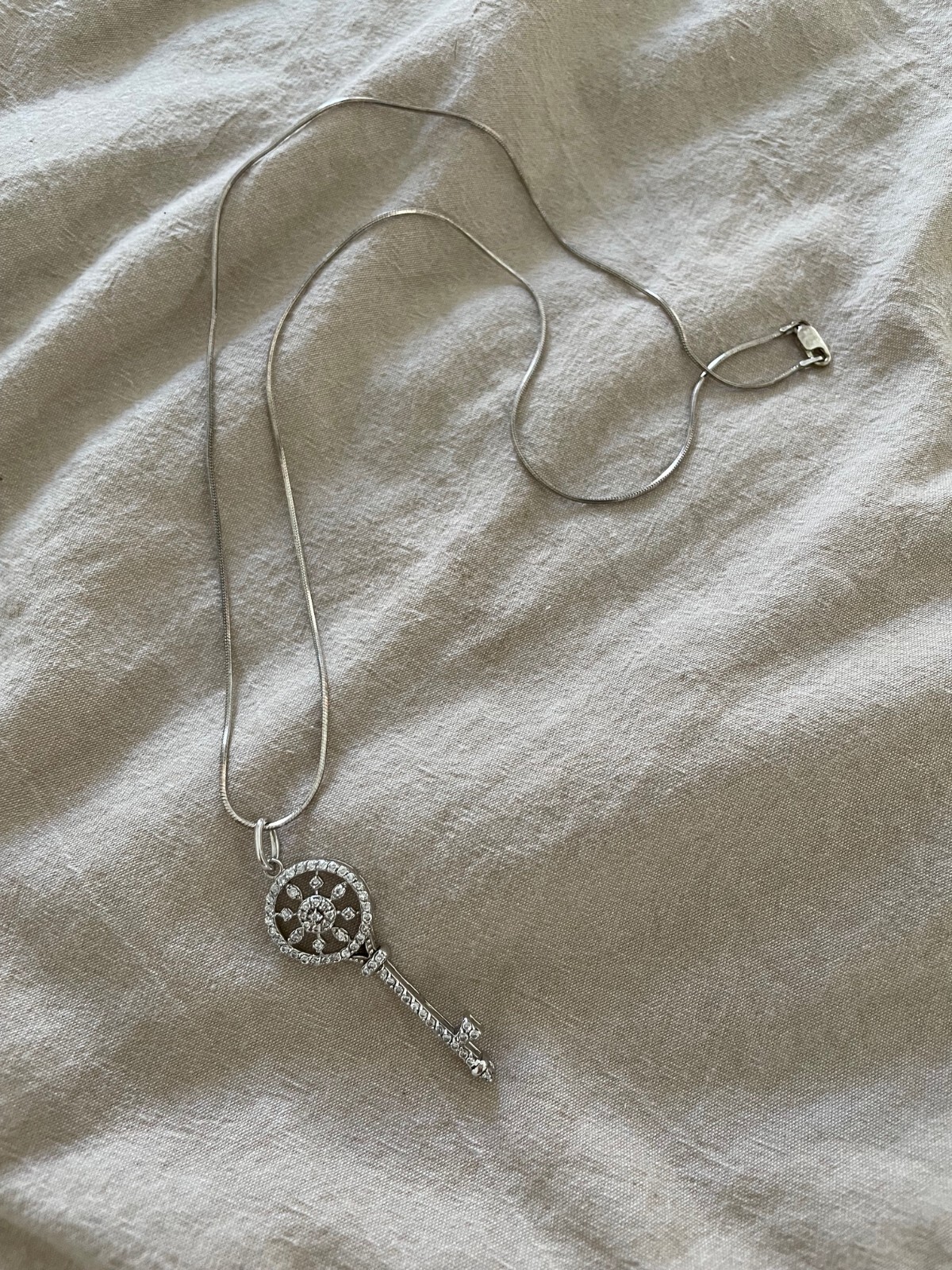 Main Stone Shape:HeartPendant/Locket Type:keyClosure:LobsterMetal:Sterling SilverStyle:Chain, PendantBrand:unknownPendant Shape:KeySetting Style:PavéType:NecklaceColor:ClearShape:keyOccasion:anyMaterial:GemstoneChain Type:snake chainMetal Purity:925 parts per 1000Main Stone:zirconiaSeller Notes:“Like New”Theme:BeautyBase Metal:Sterling SilverMain Stone Color:Clear