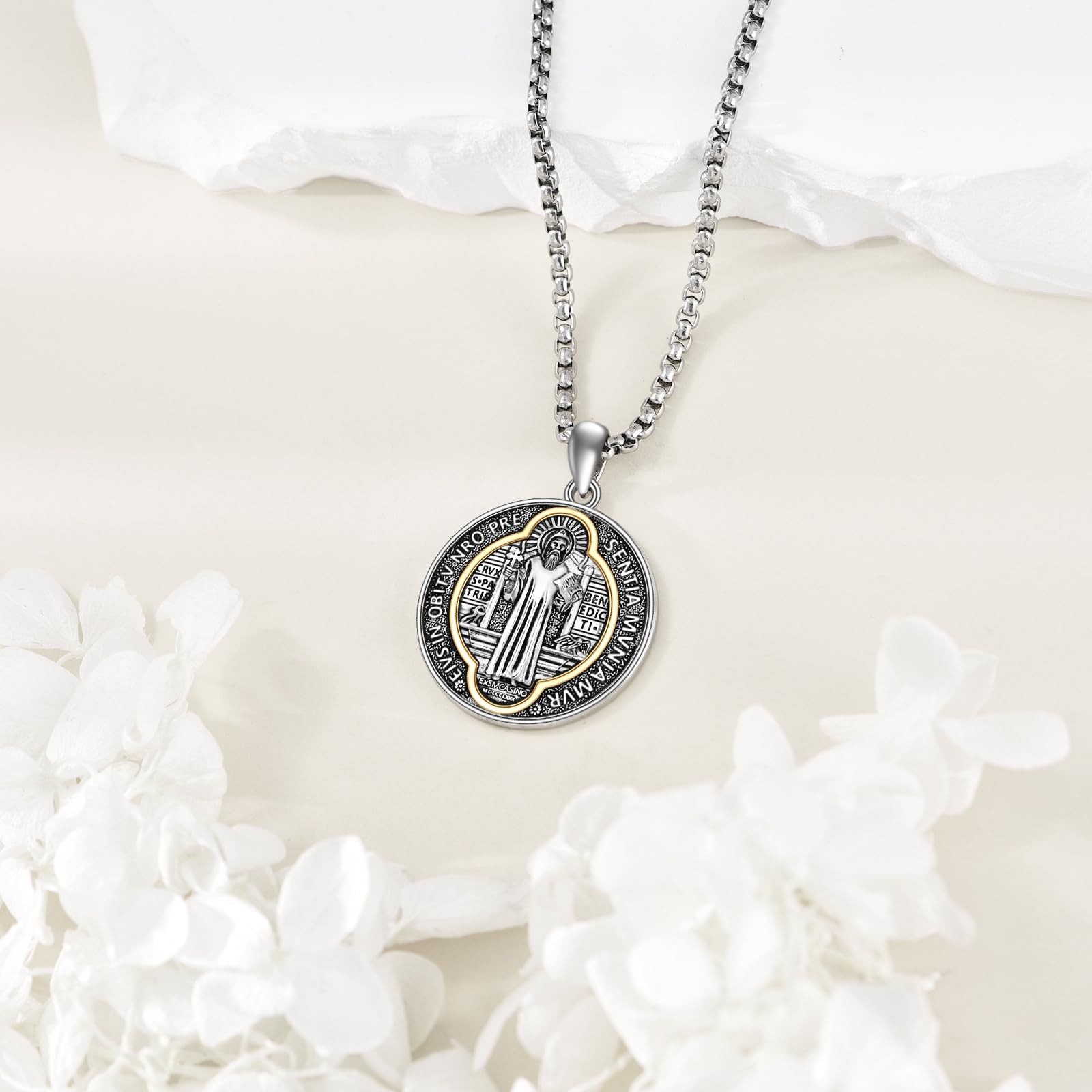 Product Features: Saint Benedict Necklace 925 Sterling Silver Talisman Pendant Round Medal Jewelry Religious Gifts for Women Men Material: S925 Size: This saint benedict necklace size is 0.98 inches(25 mm). Color : As the picture Customer Service: And rest assured, our customer service team is dedicated to ensuring your satisfaction. us with any questions, and we'll respond within 24 hours. Meaningful Necklace: The Saint Benedict Medal is one of the oldest and most respected medals used by Christians, also known as the 'Devil Chase Medal'. On its back, there are also meaningful letters that people believe wearing it can resist evil spirits, bad habits, and temptations, prevent diseases, and protect physical health. Product Material: The saint benedict necklace is made of 925 sterling silver, which has a good polishing effect, is not easy to change color or lose luster, has low allergenicity, and is suitable for long-term wear. Pendant Size: This 925 sterling silver talisman pendant size is 0.98 inches(25 mm) equipped with a 22+2-inch adjustable chain. Ideal Gift: This medal jewelry is carefully packaged in a branded gift box and is perfect as a gift for parents, friends, loved ones, and more. It can also be a perfect gift for birthdays, anniversaries, Christmas, New Year, and more! Customer Service: We are committed to providing you with satisfactory service. If you have any questions, please feel free to us and we will reply within 24 hours.