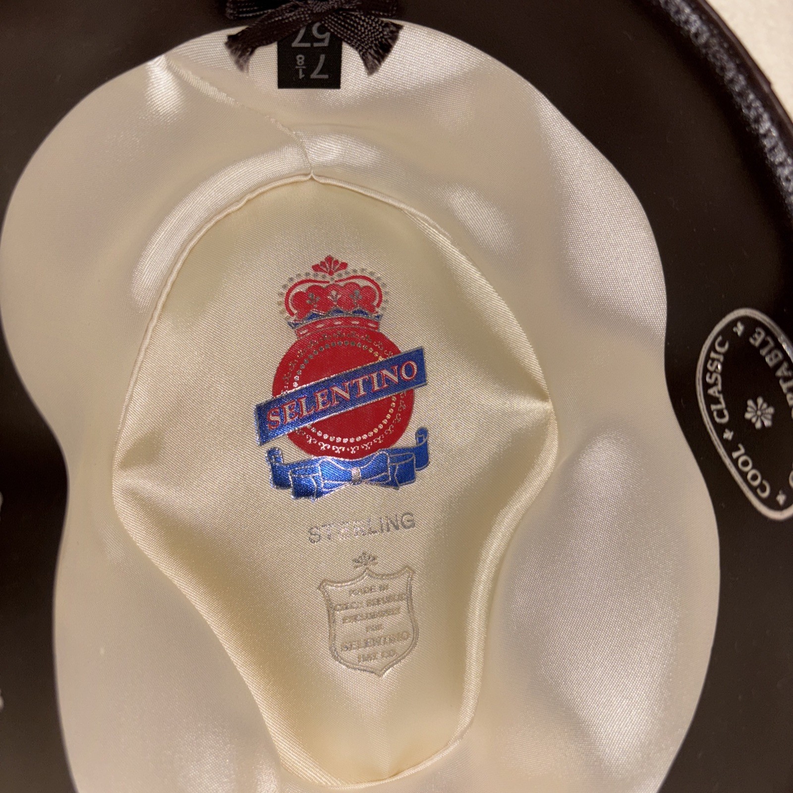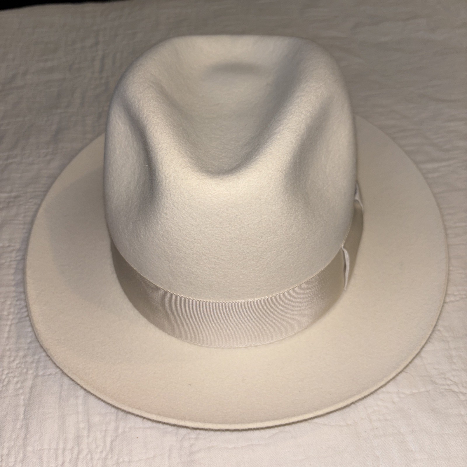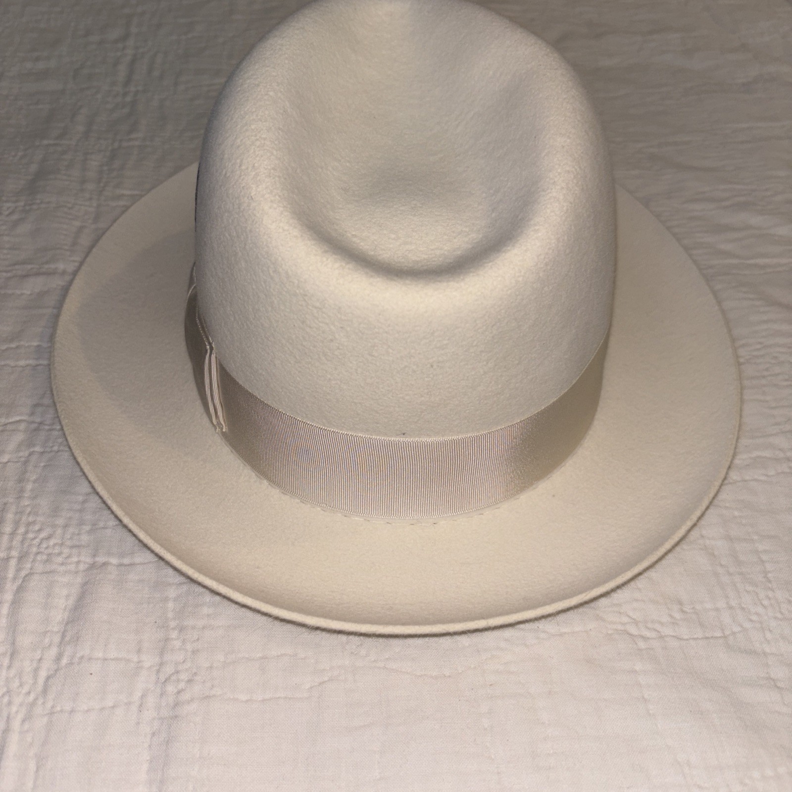 The HAT SELENTINO STERLING HAT is a 100% genuine fur felt fedora in a classic white color. This stylish and high-quality hat is perfect for various occasions such as weddings, parties, formal events, and even casual outings. With a size of 7 1/8, this fedora is designed for both men and women and features a lined interior for added comfort. Handmade with attention to detail, this American-inspired hat also includes a feather accent, making it a standout accessory for any season. Beautiful white……does not come with typical button elastic on brim…priced accordingly. New old stock I do have original box from Henry the hatter but shipping would be about 3x’s as much.