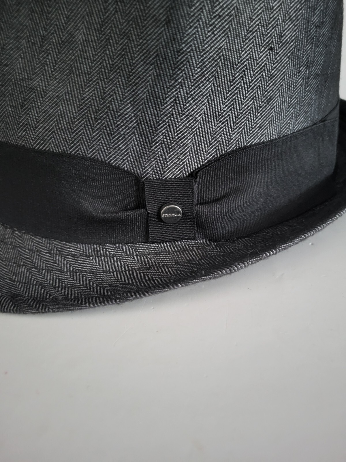 Stetson Fedora Hat for men in size Small/Medium, featuring a gray pattern. Made of lightweight polyester fabric with a lining for added comfort. The classic American-themed fedora is suitable for casual occasions in all seasons. The hat is not personalized and bears the Stetson brand.