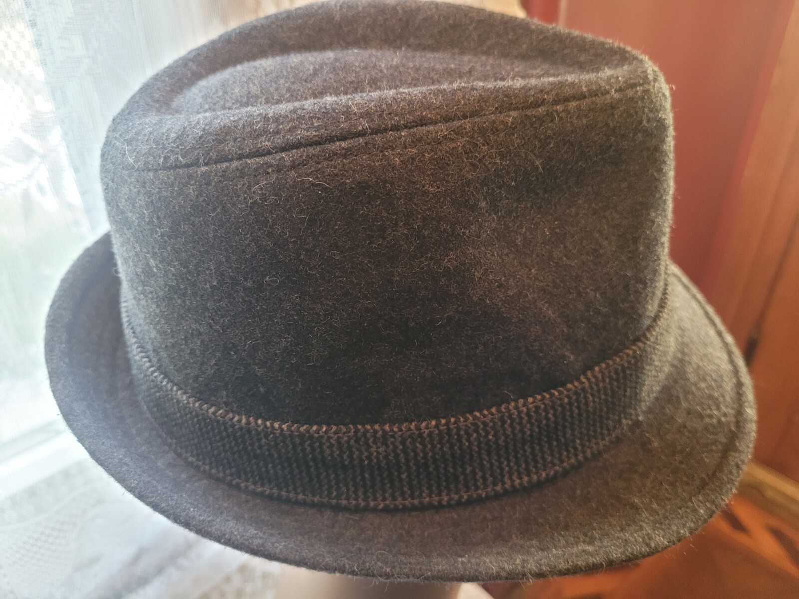 Add a touch of sophistication to your wardrobe with this classic Stetson Fedora hat. The charcoal gray color and herringbone pattern make it perfect for any occasion, whether it's for business, casual or formal events. The hat features a black band and is lined for added comfort. Made with high-quality polyester tweed, this Stetson Fedora is a stylish addition to any outfit. The hat is perfect for the fall, spring, and winter seasons. This Stetson Fedora is a must-have accessory for any fashion-conscious man. Smoke free home size Small/Medium. Purchased but never worn.