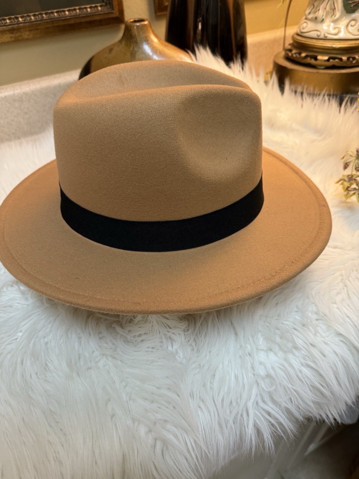 Beautiful little wool Fedora. A really cool look for just a little money.. Tan in color. One size fits all.. (adjustable) 2 3/4in brim.