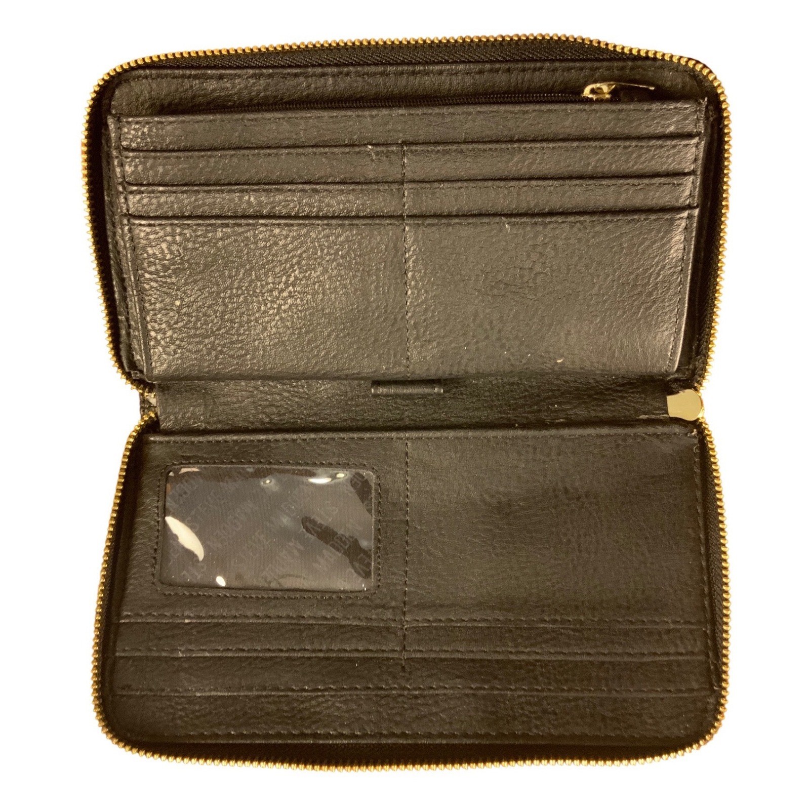 Steve Madden zip-around wallet in black pebbled faux leather with an all-over embossed logo pattern. This functional accessory features a gold-tone logo bar and matching hardware. The interior is well-organized with multiple card slots, an ID window, and a zippered coin pocket, providing ample space for essentials. Note some minor surface wear on the embossed lettering as shown in photos.