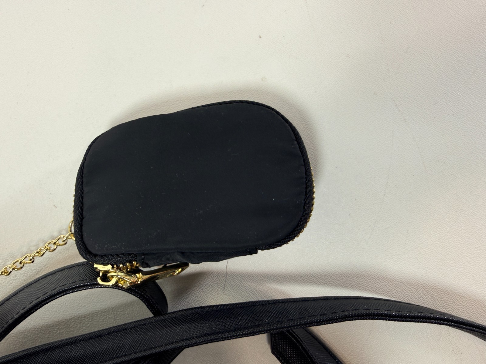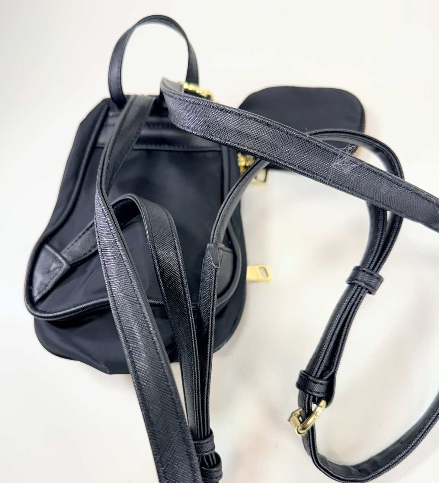 Steve Madden Mini Backpack – Black Nylon with Gold Hardware Stylish and practical Steve Madden mini backpack made from lightweight black nylon with gold-tone hardware. Features adjustable shoulder straps, top handle, and multiple zip compartments. Includes a matching attached zip coin pouch for small essentials. Details: Brand: Steve Madden Color: Black Material: Nylon Gold-tone hardware Adjustable shoulder straps Top carry handle Front zip pocket Main zip compartment Attached zip coin pouch Approximate Size: Mini / small backpack (see photos for scale and details)