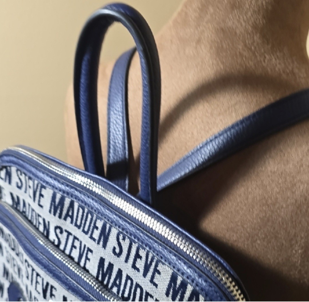 The Steve Madden Women's Backpack Purse is a stylish and practical accessory for women. Made of faux leather with gold-plated hardware, this medium-sized rectangular purse features a zip closure and adjustable black faux leather straps. The exterior color is a trendy blue, complemented by a black polyester lining. This versatile backpack is perfect for everyday use and adds a touch of designer flair to any outfit.