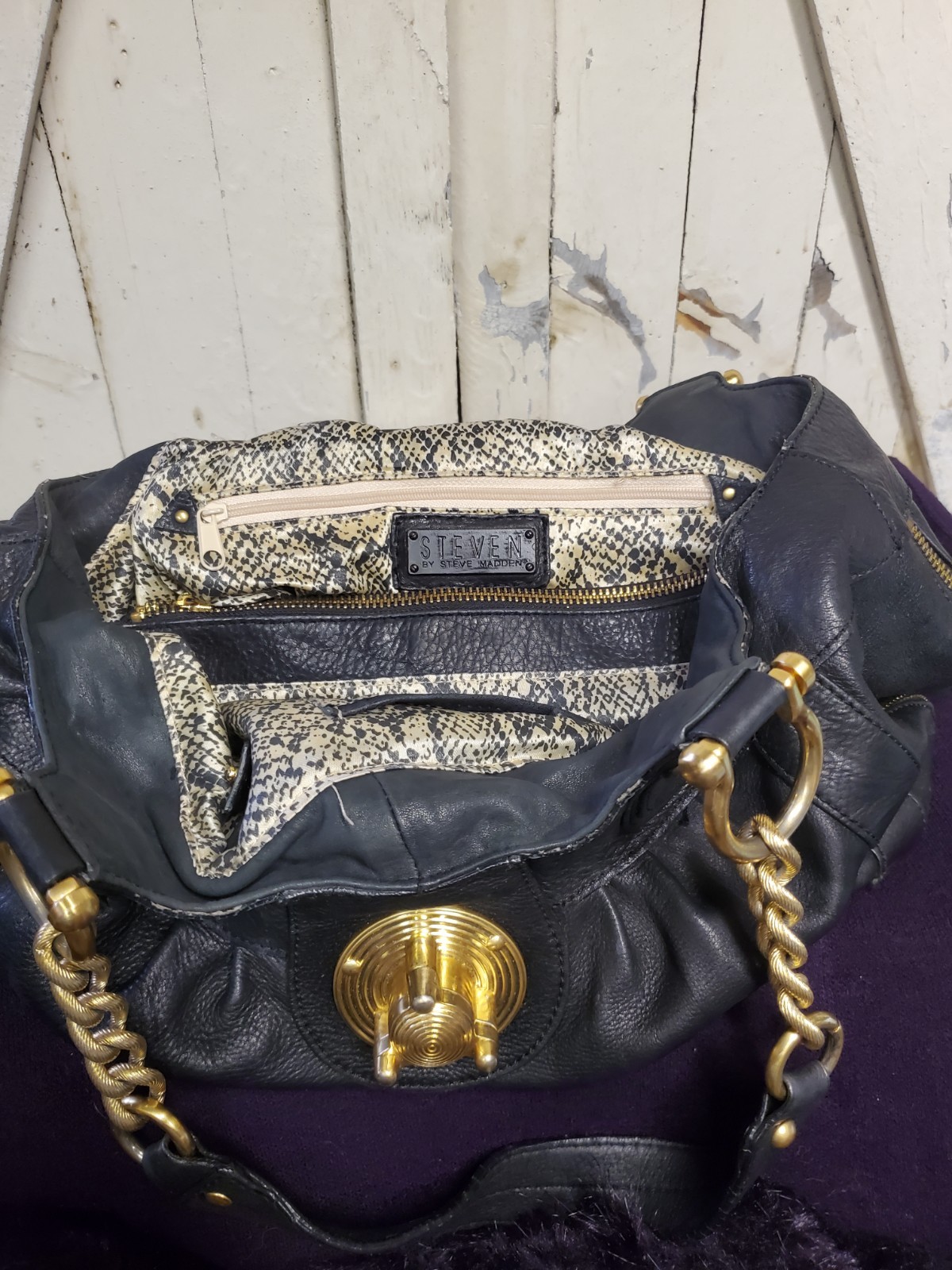 Great Steve Madden bag with gold chain details and turn lock closure, 2 zip around zippers at the bottom. Has some leather chipping on top edges on both sides (please see photos for details.