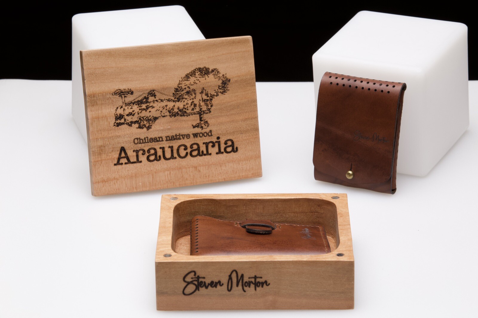 This bundle offers the following products: A classic “Top Grain” handmade wallet leather with multiple compartments; a “Top Grain” coin leather wallet with compartments for coins and credits cards; a wooden box crafted with recycle Araucaria tree.