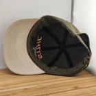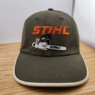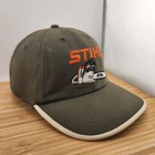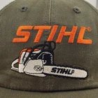 This vintage Stihl Chainsaw Hat is a classic olive cap made by K-Products in the United States. The unstructured style features a strapback for a customizable fit. Embodying an 80s outdoor theme, this hat is perfect for those seeking a retro look with a touch of American pride.