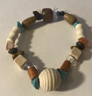 This is a handmade bracelet made of stone chips and wooden beads. The multicolored beads are strung together into a 5-inch diameter bracelet. The chip-shaped main stone is natural and the charm type is a bead. The bracelet has a beaded style and a beauty theme. It is not antique or vintage and is not from any specific era. The bracelet is not wholesale and is not undated.