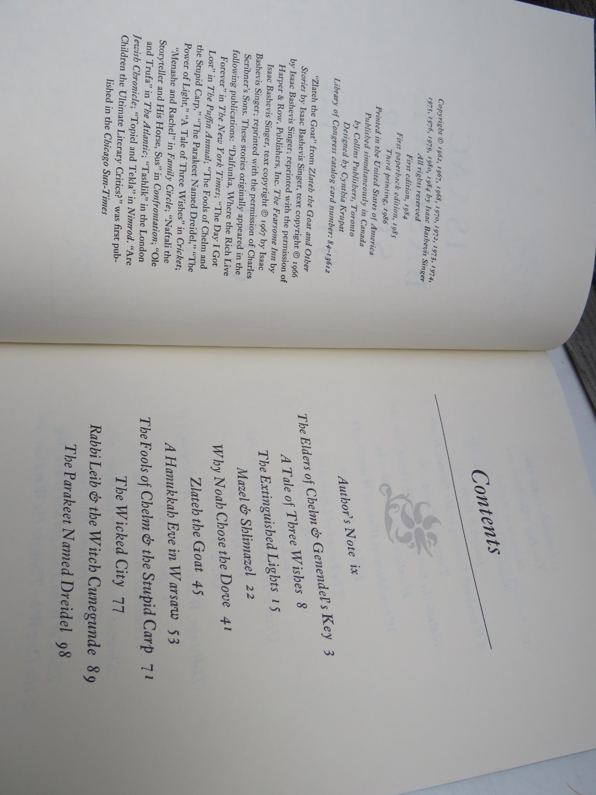 ◆ Book for Sale - Stories For Children by Isaac Bashevis Singer 1986 ◆ Author - Isaac Bashevis Singer ◆ Date - 1986 ◆ Publisher - Farrar/Straus/Giroux ◆ Place of Publication - New York ◆ Format - Hardcover ◆ Condition - Near Fine ◆ Condition Description - Very slight staining to upper dark blue front board. Private library sticker on inside front board. Bright, clean pages throughout. A few small marks to page edges. ◆ Height of Book - 24 cm ◆ Page Number - 338