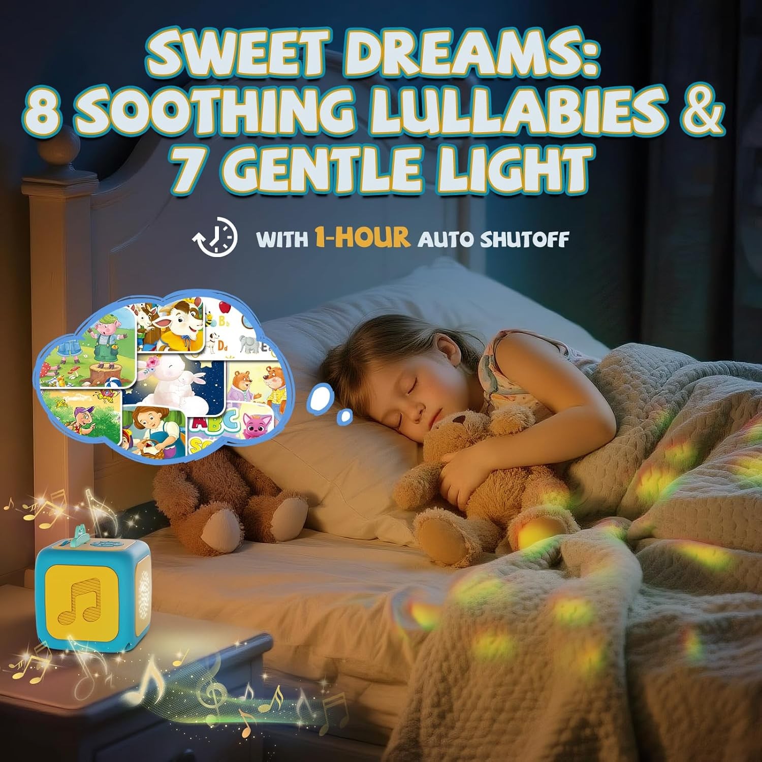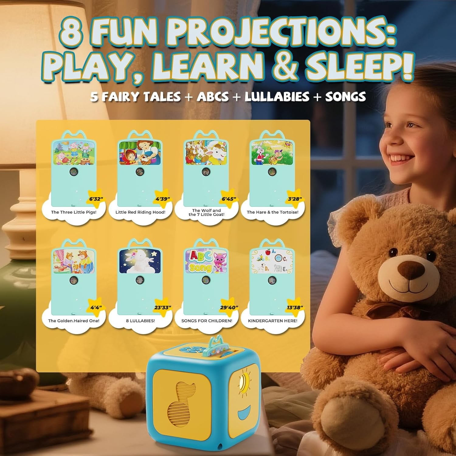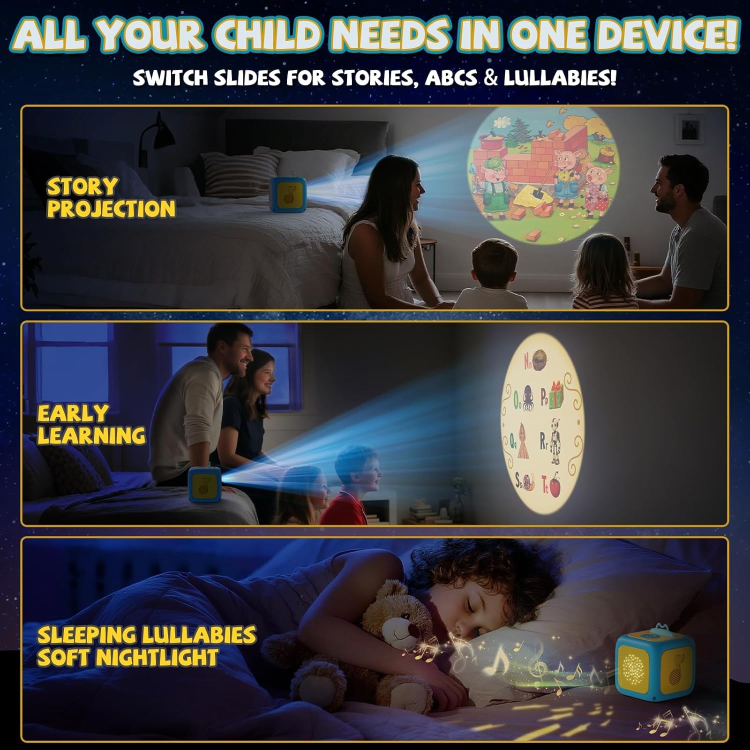Free eBay listing template designed by dewiso.com Story Projector for Kids, Story Machine with Early Learning, Music, Night Sky Lights, Storybook Projector, Moonlight Storytime Projector, Story Telling Toy for Toddlers, Gift for Kids Aged 3+ FREE AND FAST SHIPPING! All-in-One Fun & Learning Companion: More than a kids story projector, it combines story projection, early learning, nursery rhymes, and night sky lights. Perfect for storytelling, language development, or helping your child relax and sleep peacefully. One kids projector toy meets multiple needs, letting kids learn through play while feeling comforted and secure. Rich Cards Collection for Learning & Fun: Storybook projector includes 5 story cards, 1 early learning card, 1 music card, and 1 lullabies card. Kids can explore colors, shapes, animals, and numbers through engaging stories, while soothing nursery rhymes help them relax and sleep peacefully. One book projector for kids combines learning, play, and bedtime comfort all in one. Immersive Story Projection Experience: Story telling machine packs with a variety of children’s stories, this story teller machine for toddlers brings scenes to life in vivid detail with projection, music, and dynamic lighting effects. It helps kids develop focus, comprehension, and imagination, making storytime more engaging and interactive while providing high-quality, enriching companionship. Fun & Educational Early Learning: More than a story teller projector, it’s a complete early learning toy. Through fairy tales, nursery rhymes, letters, numbers, and fun science facts, kids can learn colors, shapes, and numbers while sparking language skills and imagination. Learning through play has never been this easy and enjoyable. Effective Sleep Aid: Bedtime story machine built-in 8 classic rhymes and 8 soothing lullabies help children develop language skills and a sense of rhythm. Playing gentle lullabies at bedtime creates a warm, comforting parent-child bonding experience. White noise simulates steady natural sounds, reducing distractions and helping kids fall asleep faster and sleep more soundly. Magical Night Sky Projection: Moonlight storytime projector features 7 colorful starry sky patterns to create a dreamy nighttime atmosphere. Warm tones provide a cozy, comforting feel, while cool tones help calm emotions and promote restful sleep. The gentle lighting reduces fear of the dark, allowing children to drift off peacefully under a starry sky. Portable Design & Multi-Scene Use: Lightweight and easy to operate, perfect for bedrooms, living rooms, travel, or outdoor use. Built-in auto-off timer ensures safety and energy savings. Whether at home or on the go, this toddler story book projector can accompany your child for learning, play, and sleep, making parenting easier and more convenient. The Perfect Christmas Gift for 3+ Year Old Boys and Girls: With its cute design and versatile features, this children's story teller toy makes an ideal holiday gift. Whether for birthdays, Christmas, Children’s Day, or family gatherings, it brings joy and surprise, making it the perfect choice for fun, educational, and memorable gifting. Product We offer a 30-Day Return Policy on items which you are not completely satisfied with. You have the option for a full-refund or an exchange of the item. No returns are available on items shipped outside of the US . Shipping We offer Free Shipping to the US and ship within 2 business days of payment, usually sooner. We use UPS express shipping. That's why your products are usually delivered within 3 days . Contact We try our very best to make sure every customer is completely satisfied. If there's a problem , message us! We're happy to help. 24/7 live chat available.
