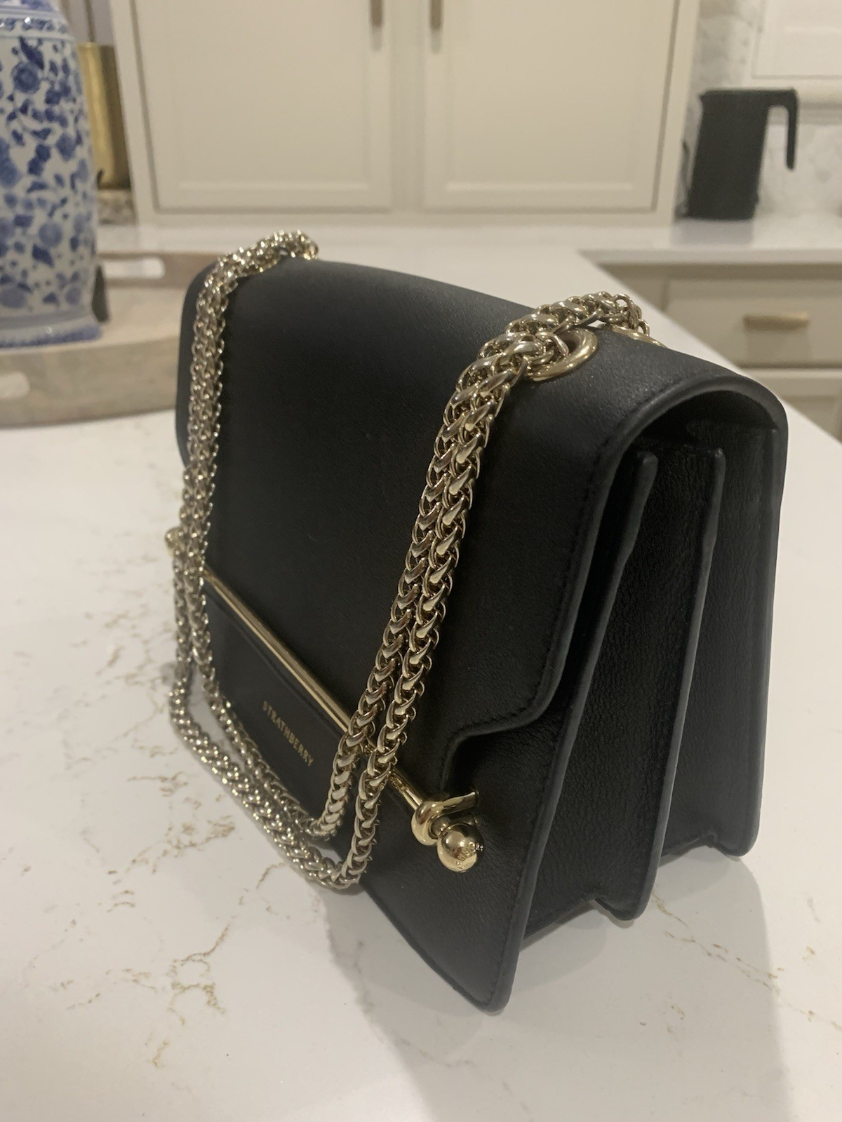 Strathberry East/West Leather Shoulder Bag Crafted of leather, this East/West shoulder bag from Strathberry is designed with an adjustable chain strap and a flap with the label's signature music bar. Adjustable chain strap Interior: one slip pocket and two compartments Flap with bar closure Leather Made in Spain SIZE About 9.1"W x 6.3"H x 4.1"D Can be carried as a shoulder bag or a crossbody bag Pre owned in great condition. There is no dust bag or box.