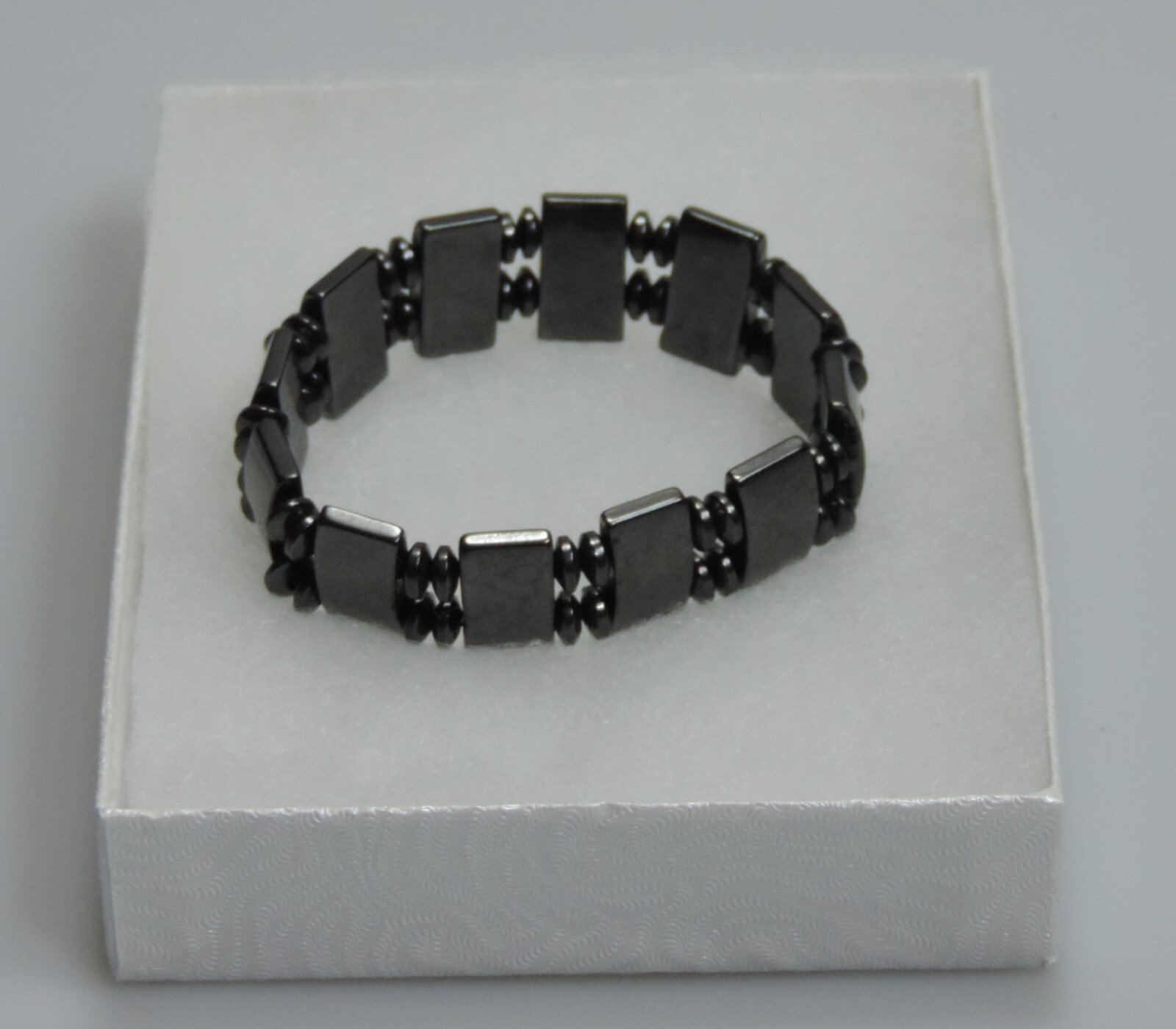 Bracelet, Stretch, Hemalyke (man-made) 6x3mm saucer & 18x10mm rectangle, 7 1/2" Mint Condition. Brand New * Measure 7 1/2" length by 3/4" width * Grey-black color goes with everything. Strung with heavy-duty elastic, this no-clasp slip-on bracelet is easy to wear. * Makes A Great Gift For Any Occasion * North Carolina Residents: The Department of Revenue requires a 6.75% sales tax. Thank you for your service to our country and thank you for shopping at Bubblehead Outfitters.
