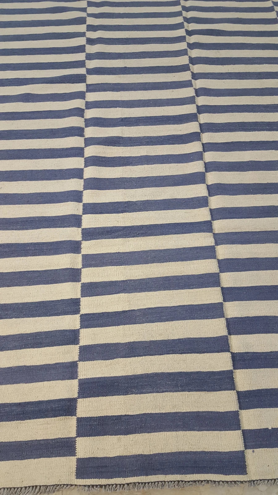 Time needed to prepare different sizes of blue and beige/off-white striped kilim rug is as follows: 4x6 feet = 10 - 15 working days 5x7 feet = 10 - 15 working days 5x8 feet = 15 - 20 working days 6x8 feet = 15 - 20 working days 6x9 feet = 15 - 20 working days 8x8 feet = 20 - 25 working days 8x10 feet = 25 - 30 working days 8x11 feet = 25 - 30 working days 8x12 feet = 30 - 35 working days 9x12 feet = 30 - 35 working days 10x10 feet = 25 - 30 working days 10x11 feet = 30 - 35 working days 10x12 feet = 30 - 35 working days 10x13 feet = 35 - 40 working days 10x14 feet = 35 - 40 working days This is the normal time we take to prepare the striped blue and beige kilim rugs; it can be few days more or less depending on the number of orders we are having at that particular time. Please confirm the exact time before placing your order.