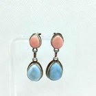Stud Earrings featuring beautiful teardrop-shaped Larimar stones in a pastel blue hue, complemented by Pink Opal stones, all set in a sleek silver bezel setting. These handcrafted earrings are perfect for adding a touch of elegance to any outfit. The butterfly closure ensures a secure fit on the earlobe, making them ideal for daily wear or special occasions.