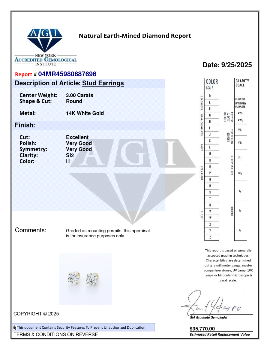 MyListerHub Template - Product MESSAGE US DIAMONDS ROUND PRINCESS EMERALD MARQUISE OVAL RADIANT PEAR HEART CUSHION ASSCHER RINGS SOLITAIRE RINGS ACCENT RINGS MATCHING BANDS THREE STONES FANCY COLOR WEEDING BAND EARRINGS STUDS PAVE DROP JEWELRY PENDANTS MEN'S RINGS BRACELETS ABOUT WHY US SERVICES CONTACT ALL LISTINGS WHY US SERVICES ALL LISTINGS Engagement Rings Natural Created Lab Created Solitaire Rings Natural Created Lab Created Bridal Ring Set Natural Created Lab Created Three-Stone Rings Natural Created Lab Created Two-Stone Rings Natural Created Lab Created Cocktail Rings Natural Created Lab Created Tennis Bracelets Natural Created Lab Created Earrings Natural Created Lab Created Pendants & Necklaces Natural Created Lab Created Men's Rings Natural Created Lab Created Men's Stud Earrings Natural Created Lab Created Stud Earrings Solid 14K White Gold Classic AGI Cert 3 CT Round Natural Mined Diamond H SI2 Buy It Now: $17,420.00 ( Free Shipping ) 10% OFF. Limited Quantity Est. Retail Price: $30,570.00 You save: $13,150.00 ( 43 % off) ITEM DESCRIPTION: Elevate your elegance with these classic round stud earrings, designed in a timeless basket setting that showcases the brilliance of their natural H color diamonds. Crafted with meticulous attention to detail and secured by four prongs, these studs make the perfect gift for birthdays or anniversaries, symbolizing love and cherished memories. Their enduring style ensures you'll wear them for years to come, providing an investment in both beauty and joy that you'll treasure forever. Message YOUR ORDER WILL INCLUDE Diamond Certification Appraisal Report Quality Packaging 30-Day Return Jewelry Warranty Free Upgrade Free Cleaning & Servicing Free Shipping 100% Refund Free Ring Resizing STONES Gem Type: Natural Shape: Round Carat Weight: 3.00 Ct Total Cut: Excellent Color: H Clarity: SI2 Polish: Very Good Symmetry: Very Good Girdle: Medium Culet: None MOUNTING Metal: 14K White Gold Style: Studs Setting Type: 4-Prong Finish: Polished Total Gram Weight: 2 g Post Material: Gold Certificate: AGI Report #: 04MR45980687696 Gender: Women ITEM CONDITION At 47 Diamond District all diamonds are certified and authentic. Our jewelry is brand new and never been worn. Our products are designed in the USA and are shipped from our factory, after being inspected, and come with a jewelry box and certificate. Our Promise Diamond Certification Appraisal Report Quality Packaging 30-Day Return Jewelry Warranty Free Upgrade Free Cleaning & Servicing Free Shipping 100% Refund Free Ring Resizing AGI CERTIFICATE Accredited Gemological Institute Natural Earth-Mined Diamond Report Date: 9/25/2025 Report # 04MR45980687696 Description of Article: Stud Earrings Weight: 3.00 Carats Shape & Cut: Round Metal: 14K White Gold Finish: Cut: Excellent Polish: Very Good Symmetry: Very Good Clarity: SI2 Color: H Culet: None Girdle: Medium Comments: Graded as mounting permits. this appraisal is for insurance purposes only. COPYRIGHT © 2025 TERMS & CONDITIONS ON REVERSE $35,770.00 DELIVERY INFORMATION DOMESTIC FREE UPS Next Day Air 1 Day INTERNATIONAL FREE UPS Worldwide Expedited 1 - 3 Days Warranty We sell only authentic, original and conflict-free diamonds and jewelry that have never been worn before. All of our products are shipped from our factory in New York City after being tested and examined in a very high standard by a professional team that is responsible for quality control. Therefore, it is very unlikely that your purchase will arrive incomplete. Also, every piece of jewelry and diamonds are being graded by GIA graduate gemologists and come with its original appraisal and an authentication certificate. Return 30 days return policy. Money-back guarantee. Item must be returned with the original box, certificates, and papers. Item must be in the same condition as it was received. No refund for shipping fees, custom-made orders. Customs taxes & duties are non refundable. Buyer must contact before shipping back in order to receive a Return Authorization Number (RAN). All returned packages must be insured. Shipping We require 2 business days for handling. Ring Resizing will add 2-4 days to our regular handling time. PayPal payments will only be shipped to PayPal confirmed address. We DO NOT Ship to PO Box. All shipments are insured and require an adult signature. International Customers need to pay their Taxes, VAT, and Duties. International Customers must provide a telephone number so customs can contact them when the package arrived. IT'S THE WORLD'S DIAMOND DISTRICT FOR A REASON MESSAGE US Business Hours: MON - FRI 9AM-6PM DIAMONDS RINGS EARRINGS BRACELETS PENDANTS 2025 © 47 Diamond District All Rights Reserved. 69758VIV13084 F-J9D9-VIV13084-5197-R418 Classic Basket Studs 4 Prong Diamond Stud Earrings 3 Carat Round Earrings 14K White Gold Earring Round Diamond Earring Classic, Basket, Studs, 4 Prong, Diamond Stud Earrings, 3 Carat, Round, Earrings, 14K White Gold Earring, Round Diamond Earring, Anniversary Gift , , ,