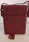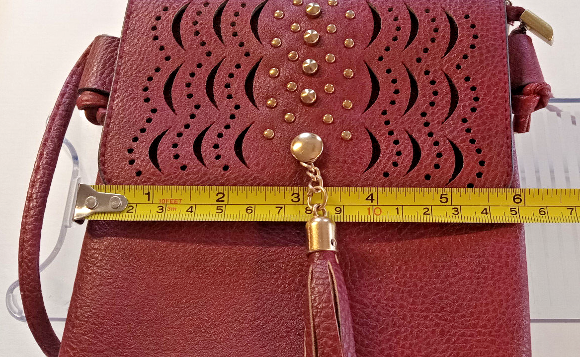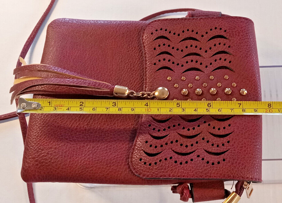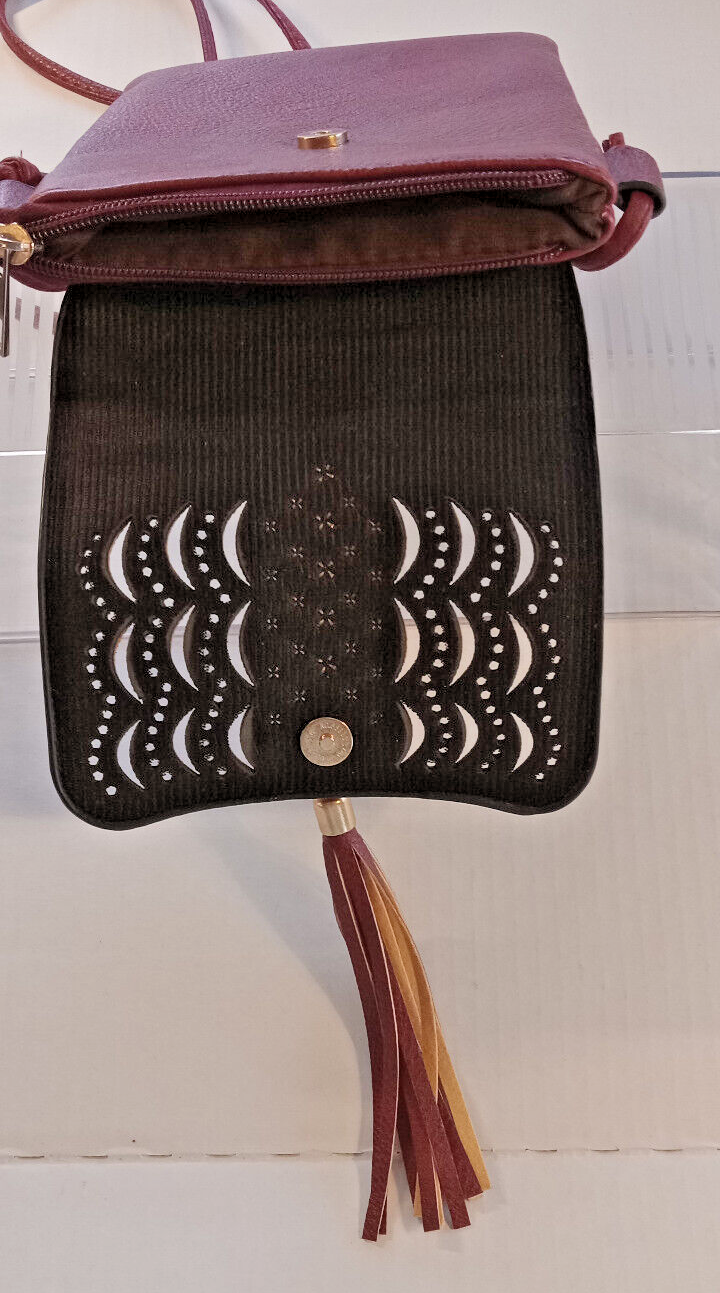 This beautiful crossbody bag features stunning laser cut and studded accents on a rust/wine faux leather exterior. The bag is small in size with a width of 6 inches and a height of 8 inches, making it perfect for carrying your essentials. The snap closure and gold hardware add a touch of elegance, while the rust/wine color and colorful theme make it a stylish accessory for any outfit. The handle/strap is made of faux leather in the same rust/wine color, and the lining is brown. This unisex bag is ideal for anyone looking for a colorful and fashionable accessory. Please see all pictures they are a part of my description. All sales are final. Thank you for looking! Please take a look at my other listings.