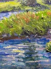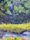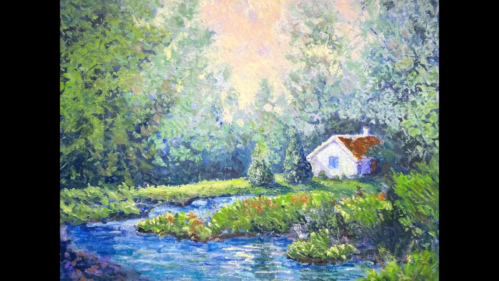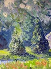 This captivating impressionist painting presents a serene scene of a quaint cottage, nestled within a lush, vibrant landscape. The cottage, with its white walls and warm, inviting roof, stands as a focal point amid the dense greenery that surrounds it. The artist's masterful brushstrokes create a sense of depth, capturing the way sunlight filters through the leaves, casting dappled shadows across the scene. The vibrant foliage, depicted in various shades of green, adds a lively and refreshing quality to the composition, making the viewer feel as if they are gazing into a peaceful, secluded haven. The use of color in this piece is particularly striking, with the artist employing a range of blues and greens to depict the foliage and water. The cool tones of the water contrast beautifully with the warmer hues of the cottage roof, creating a harmonious balance that draws the viewer's eye across the canvas. The reflections in the water are rendered with delicate precision, capturing the way the light dances on the surface, adding a sense of movement and life to the otherwise tranquil scene. The texture of the painting further enhances its immersive quality. The thick, expressive brushstrokes give the foliage a tactile, almost tangible quality, inviting the viewer to reach out and feel the leaves and branches. The contrast between the smoothness of the water and the rough texture of the greenery creates a dynamic interplay that adds depth and dimension to the piece. The artist's skillful use of impasto technique brings an added layer of realism to the painting, making the natural elements feel almost alive. As the eye moves through the painting, one can almost hear the gentle rustling of leaves in the breeze and the soft murmur of the stream as it flows past the cottage. The peaceful atmosphere is further enhanced by the soft, diffused light that bathes the scene, suggesting a moment of early morning or late afternoon, when the world is still and quiet. This sense of calm and tranquility is a hallmark of the impressionist style, capturing not just the visual beauty of the landscape but also its emotional resonance. Overall, this painting is a celebration of nature's beauty, capturing a moment of perfect harmony between the human-made and the natural world. The artist's use of color, texture, and light creates a scene that is both visually stunning and deeply soothing. This piece would make a perfect addition to any collection, offering a moment of peace and a reminder of the simple, yet profound beauty that can be found in the world around us. Whether displayed in a living room, study, or bedroom, this painting is sure to inspire and delight all who see it.