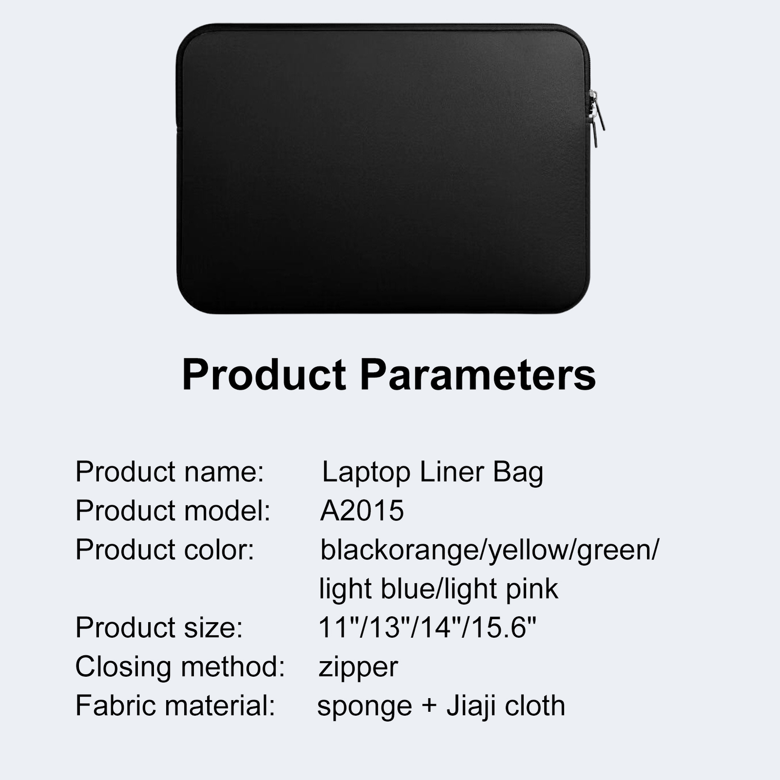 Features: Colors available, brand new, and high-quality. Multiple materials provide multiple-layer protection from dust, water, scratching, or shocks. Ultra-slim lightweight design which makes it so convenient for daily use and traveling wherever you go. The smooth top-loading zipper on the bag glides smoothly, allowing for easy and convenient access to your tablet. Fashionable and elegant appearance, perfect for all brands of tablets, suitable for Travel, Office, School, Home, etc. Material: sponge Opening method: zipper With or without liner: no The internal structure of the bag: computer pocket Function: breathable, wear-resistant, shock-resistant, load-reducing Applicable product type: Notebook Luggage size: small Whether with lock: no Model: A2015 Colour: Black Size: 11 inches, 12 inches, 13 inches, 14 inches, 15 inch Product List 1*Laptop Sleeve Case