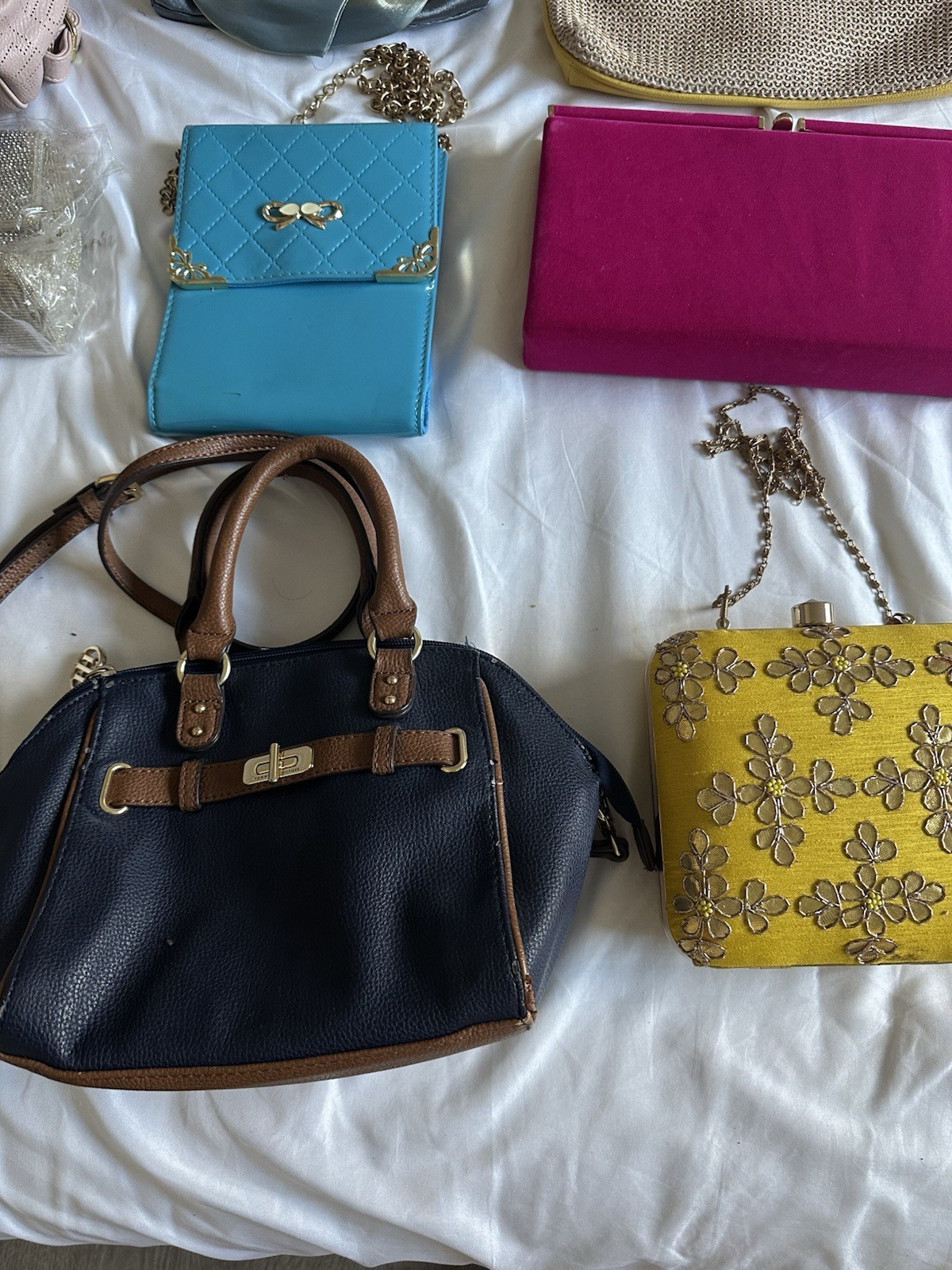 Lot of 13 bags. Fast shipping.Comes from smokefree, pet free home. Purple/ Lilac Aldo bag. New Guess laptop sleeve. New Silver sequins bow clutch. New Pink velvet clutch. New Yellow with golden leaf work crossbody. Worn once. Grey small clutch with bow. Used Sky blue crossbody with metallic bow and corner protector. Used in good condition. Steve madden backpack. Used, shows signs of wear Tommy Hilfiger blue crossbody with top Handel. Used, shows signs of wear. Leather pealing Caspers yellow crossbody. Used, shows signs of wear. Mini sky blue with bow crossbody purse. Used, shows signs of wear Pink mini wristlet. New Red small pouch, wristlet. New