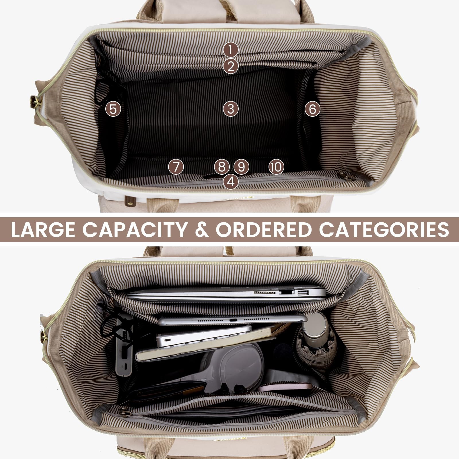 This backpack is made of high quality waterproof and scratch resistant polyester fabric with custom materials. It has a contrasting two-tone design and the base is matched with high quality PU leather. The new colours make your eyes shine. 39.5 cm. Dimensions: 29 x 14 x 42.5 cm. Passenger for 14-15.6 inch laptops/11 inch iPad. Weight: 0.8 kg. 44 cm. Dimensions: 30.5 x 14 x 44.5 cm. Passenger for 14-17.3 inch laptops/11 inch iPad. Weight: 0.9 kg. Material: Canvas This ladies backpack has a 12 month quality guarantee. Whether you encounter any problems when using the backpack, please feel free to contact us at any time. We will reply you within 24 hours. 【Large Capacity Work Backpack】backpack purse for women uses a rectangular frame opening design to maintain large capacity and facilitate your quick access. 【Multi-Compartment Laptop backpack】 Laptop backpack has a total of 5 compartments and 19 pockets, which are convenient for your organization and storage. 【Dimension】16.7*11.4*5.7 inch, Contains a separate computer compartment that can accommodate 15.6 inches and an iPad slot that can accommodate up to 12.9 inches. 【Anti-Theft Pocket】Luggage strap allows you to easily fix your backpack on the trolley case. The anti-theft pocket on the back makes your valuables safer and your travel easier. 【Comfy & Sturdy】The shoulder belt and back are equipped with high-quality foam pads, which are breathable and pressure reducing. The large capacity and elastic side pockets can hold about 42 oz water cups.