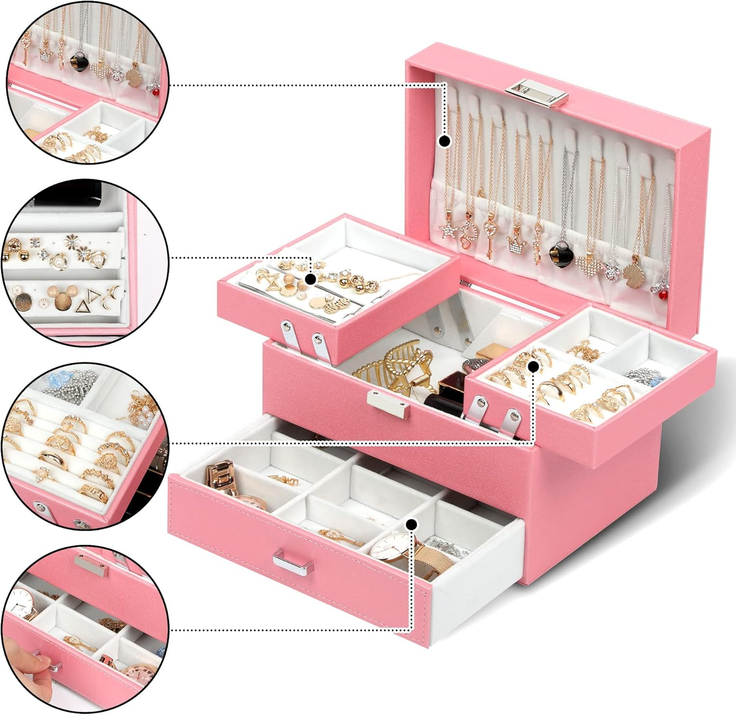 Store New Arrivals Add to Favorite View Feedback Contact Jewelry Box for Girls Women, PU Leather Jewelry Organizer Box, 3 Layers Jewelry Gift Box for Christmas, Valentine'S Day, Birthday, Mother'S Day (Pink) Description Item model number SJ21JB0001 Style Modern Number of Items 1 Country of Origin China Jewelry Storage Type Jewelry Box Number of Compartments 16 Batteries required No Special Feature Dustproof, Durability, Adjustable, Storage Jewelry Product Dimensions 9.1"D x 6.3"W x 5.71"H Material Faux Leather Number of Drawers 1 Included Components Drawer Closure Type Magnetic Item Weight 2.2 pounds Occasion Mother's Day, New Year, Christmas, Birthday, Valentine's Day Target Audience Women, Girls Mounting Type Freestanding Color Pink Inner Material velvet Shape Rectangular Recommended Uses For Product Necklace, Bracelet, Ring, Watch, Jewelry, Earring, Bangle Number of pieces 1 3 Layers of Large Capacity: The large jewelry storage box has 5 ring slots, 9 ring boxes, 10 necklace hooks, 26 ear stud holes, 2 adjustable space compartments, when you stretch them out, you will find a large compartment hidden underneath, a large space for large pieces of jewelry you want to put. The jewelry organizer box has a variety of designs and compartments, which can store all your jewelry, whether it is a large piece of jewelry or a small earring, there is a place to store it. Advanced Materials: This jewelry box is made of PU leather, which is dirt-resistant, waterproof, non-deformable and easy to clean. The inner lining is wrapped in comfortable and soft velvet to provide all-round protection for your jewelry, and with a smooth and exquisite metal buckle for easy opening and closing. Space-Saving Jewelry Holder: With our jewelry display case, all your jewelry will be organized and easy to access. From then on, you have a bright dressing table that saves a lot of space and makes your room look more tidy and elegance. Moreover, the classification design of our travel case for jewlery makes your jewelry clear at a glance, reducing the time for searching. New upgrade: The size of this jewelry storage box is enlarged, 9.1 x 6.3 x 5.71 inches when closed. This jewlwey organizer container for dresser has undergone a new upgrade in the functional partition, making full use of every place to store your rings, necklaces, bracelets, earrings, earrings, hair clips, watches and other small accessories. The girls jewelry box is reasonably structured and sturdy to keep all your jewelry in order Ideal Jewelry Gift Box: This velvet jewelry organizer looks elegant and considerate. The jewelry tray for drawers is the perfect gift for yourself, your friends, wife or mother for birthdays, Christmas, Valentine's Day, Mother's Day and anniversaries . The jewelry holder box can be used not only as a girls jewelry box, ring storage box, necklace organizer box, earring case organizer, but also as a gift box for bracelets. Product Description Some Details about the Jewelry Box 1 3-Layer 2 Some Details Jewelry Box for Gift Whether you are treating yourself or giving a gift to your girlfriend, wife, mother or other loves for Birthday, Mothers' day, Valentine's Day, Christmas, Anniversary Day, or Wedding. Our Dajasan jewelry box organizer is a ideal choice. Best Gift for Yourself The video showcases the product in use. The video guides you through product setup. The video compares multiple products. The video shows the product being unpacked. Unique Design Detachable Design The jewelry box for women has a detachable design to meet your different needs. You can choose to install or delete them as needed. Movable Metal Frame The movable design of the jewelry organizer box makes it easy to reach the jewelry, and when you move it, you will find a large hidden space inside. Pick Your Favorites Add to Cart Add to Cart Add to Cart Add to Cart Add to Cart Add to Cart Customer Reviews 4.6 out of 5 stars 3,858 4.6 out of 5 stars 3,858 4.6 out of 5 stars 831 4.6 out of 5 stars 831 4.6 out of 5 stars 3,858 4.4 out of 5 stars 42 4.7 out of 5 stars 429 Price $35.99 $ 35 . 99 $35.99 $ 35 . 99 $35.99 $ 35 . 99 $33.99 $ 33 . 99 $36.99 $ 36 . 99 — $21.99 $ 21 . 99 Size 9.1*6.3*5.71inch 9.1*6.3*5.71inch 9.1*6.3*7.48inch 9.1*6.3*7.48inch 9.1*6.3*5.71inch 11.54*4.53*4.53inch 10*7.68*3.74inch Material Leather Leather Leather Leather Velvet Leather Velvet Color Pink Rose Gold Black Champagne Green Black Purple Weight 2.2lb 2.2lb 2.93lb 2.93lb 2.2lb 1.48lb 1.81lb Number of Tiers 3 3 4 4 3 2 2 Pick Your Favorites Add to Cart Add to Cart Add to Cart Add to Cart Add to Cart Add to Cart Add to Cart Customer Reviews 4.6 out of 5 stars 3,858 4.6 out of 5 stars 111 4.7 out of 5 stars 741 4.7 out of 5 stars 741 4.5 out of 5 stars 269 4.5 out of 5 stars 269 4.5 out of 5 stars 81 Price $35.99 $ 35 . 99 $9.49 $ 9 . 49 $15.99 $ 15 . 99 $8.99 $ 8 . 99 $9.99 $ 9 . 99 $8.99 $ 8 . 99 $9.99 $ 9 . 99 Size 9.1*6.3*5.71inch 6*4.13*2inch 6*4.13*2inch 3.95*3.95*1.97inch 3.95*3.95*1.97inch 3.95*3.95*1.97inch 3.54*3.95*1.57inch Material Leather Crocodile Leather Velvet Velvet Velvet Velvet Leather Color Champagne Black Dusty Pink Blue Green Green Pink Weight 2.2lb 6.7ounce 6.7ounce 4.6ounce 4.6ounce 4.17ounce 3.88ounce Number of Tiers 3 1 1 1 1 1 1 ABOUT US We offer the best prices around on high quality products. Our E-store includes media such as books, movies, music and games while offering electronics, toys, sporting apparel, clothing, tools, general home, garden items and more. SHIPPING We are always working hard to ensure your package arrives as soon as possible. Please understand that some factors like weather, high postal traffic, and the performance of shipping companies are outside of our control. We offer free shipping to the lower 48 states and ship within 2 business days of payment, usually sooner. We do not accept P.O. Boxes. Please provide a physical address. For shipping outside of the continental USA, we only use eBay's Global Shipping Program.The item is ship