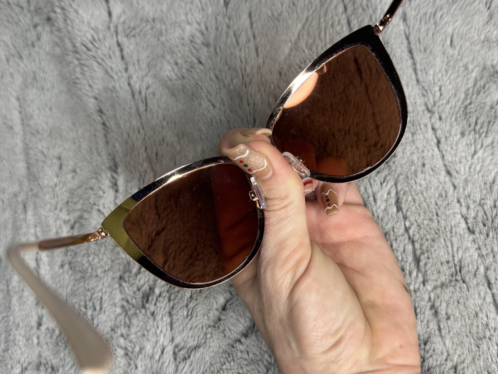 Rose gold frame color, with a dusty pink cat eye around the lenses. Lens color is a goldish brown. Lightweight frames, making long wear very comfortable.