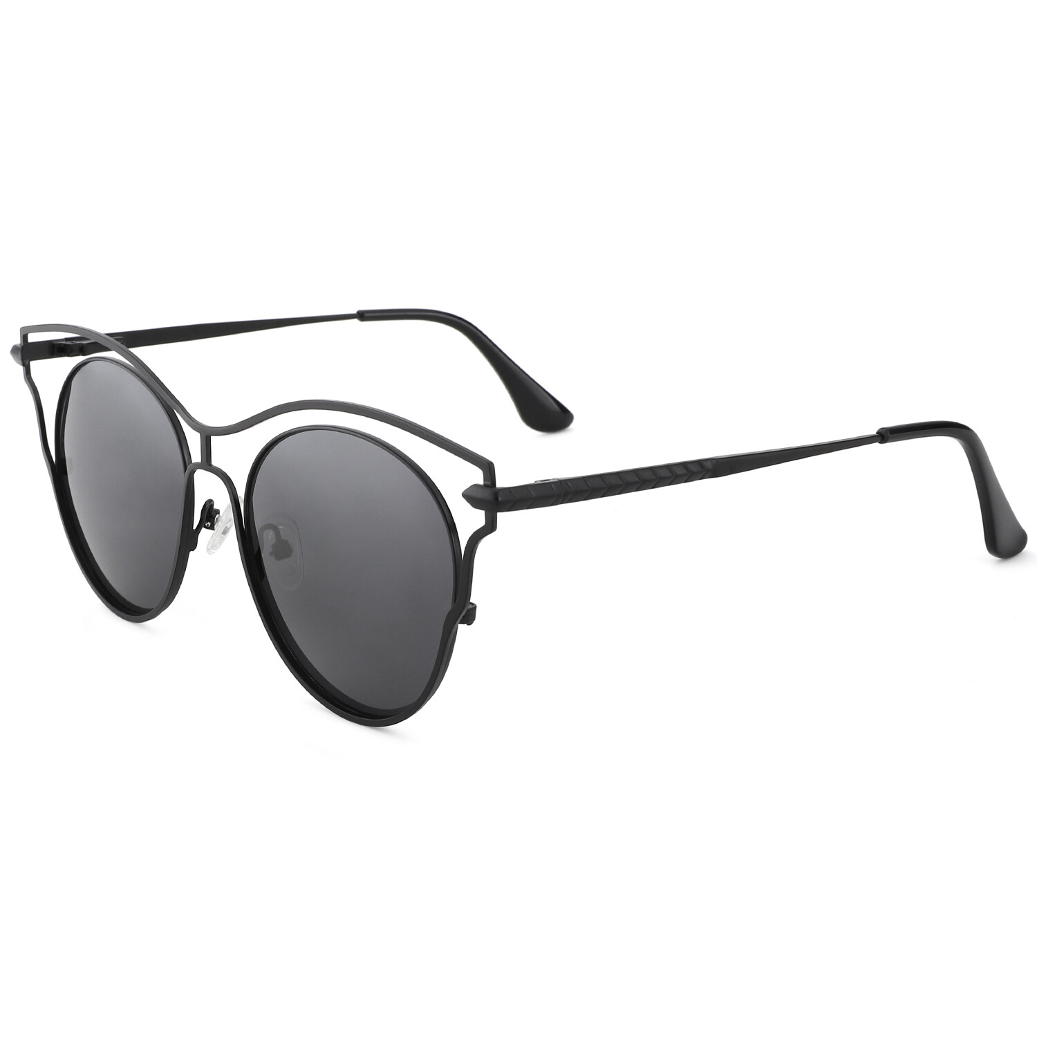SPECIFICATIONS Block 100% UVA / UVB / UV400 wavelengths : Yes Polarized lenses : Yes Wrap & Angle : Low Rim: Full Rim Shape: Cat-Eye Material: Metal FRAME SIZE Lens Width: 52 mm Bridge: 19 mm Temple Length: 140 mm