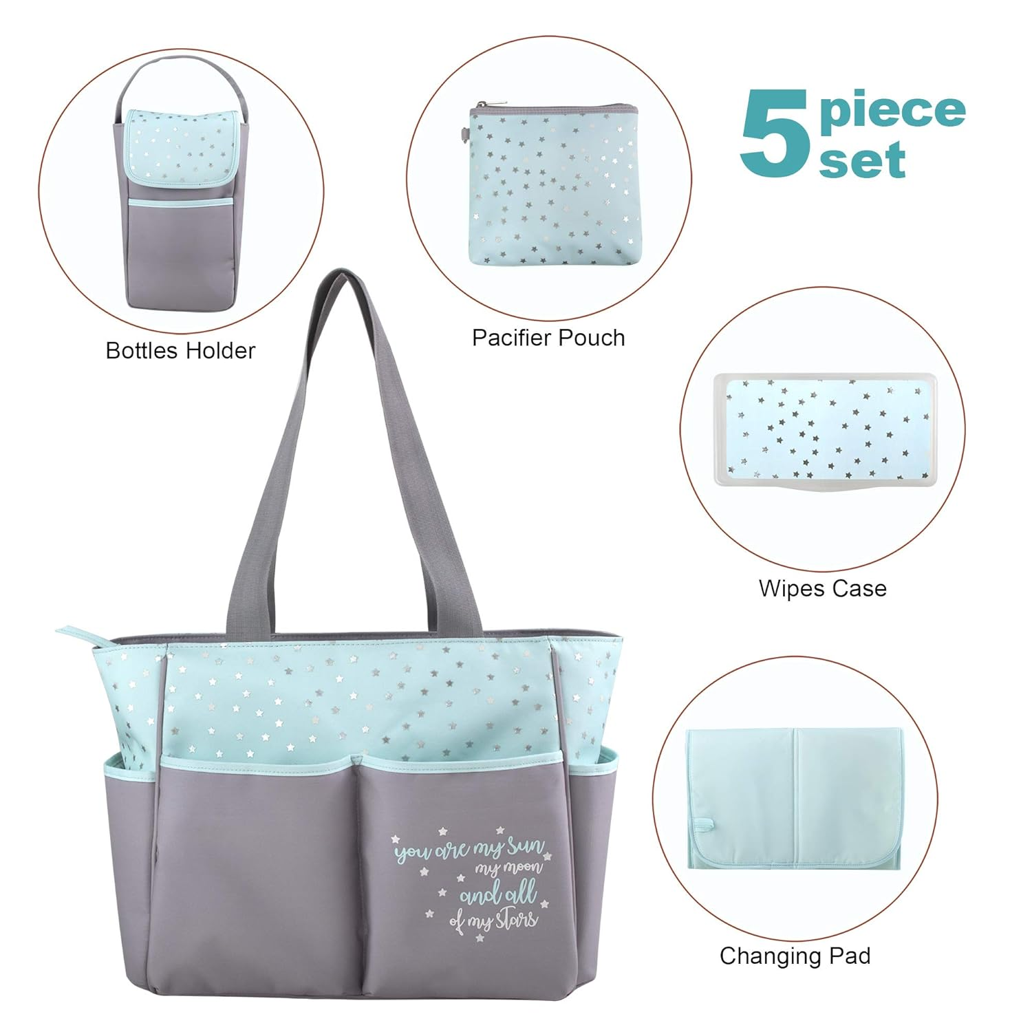 Store New Arrivals Add to Favorite View Feedback Contact Diaper Bag Tote 5 Piece Set with Sun, Moon, and Stars, Wipes Pocket, Dirty Diaper Pouch, Changing Pad (Grey/Aqua) Description Item model number 9229s Country/Region of origin China Batteries required No Is Discontinued By Manufacturer No Product Dimensions 12 x 5.5 x 14 inches Care instructions Machine Wash Material Type Polyester Item Weight 1.8 pounds Color Grey/Aqua Additional product features Waterproof, leak_resistant Polyester LARGE CAPACITY MESSENGER TOTE: Carry and access everything your baby needs, with ease FIVE EASILY ACCESSIBLE POCKETS: Exterior of diaper bag organizes baby’s favorite toys, stuffed animals, games, wallet, sanitary wipes, tissues, and more. Grab whatever you need, even if you only have one hand free INCLUDES AN INSULATED BOTTLE HOLDER: Fits up to 2 bottles, and snacks. Who’s hungry? Not baby COMES WITH CHANGING PAD AND MATCHING WET WIPES CASE: Who says moms and dads don’t care about appearances? Be fashionable, organized, and trendy as you walk down the street with your little one in the stroller FULLY LINED INTERIOR: Helps contains messy spills. We all know accidents happen. Now, they’re no big deal Product Description The Starry Night bag is made with love. Cute and stylish, this diaper bag purse has it all. Incredibly roomy, easily fit teething rings, pacifiers, baby shoes, clothes, and more. Features include: 1. An insulated, matching bottle bag that fits up to 2 bottles 2. A matching wipes case 3. Matching change mat 4. Fully lined wipe-clean interior 5. Lightweight, soft polyester material, with hand-carry or shoulder straps 6. 5 external slip pockets for easy access to diapers, cellphone, magazine, toys, pacifier, car keys, & more 7. Handy (and of course, also matching) storage case for accessories 8. Warm colors perfect for boys or girls, with a sweet statement of love on bag for your new baby Our 5 piece gift set is the perfect baby shower gift for expecting moms and dads. Dimensions! So, how big is it? Travel bag measures 12" x 14" x 5.5", and the bottle bag that comes as part of the set measures 10" x 6" x 3". Baby Essentials : Not Just the Basics is a family company. Add to Cart Add to Cart Add to Cart Customer Reviews 4.8 out of 5 stars 3,804 4.8 out of 5 stars 3,804 4.8 out of 5 stars 3,804 4.6 out of 5 stars 146 4.6 out of 5 stars 24 4.4 out of 5 stars 96 Price — $29.99 $ 29 . 99 $29.99 $ 29 . 99 $29.99 $ 29 . 99 — — 5 Piece Set ✓ ✓ ✓ ✓ Stroller Straps ✓ ✓ ✓ ✓ Comes with Wipes Case ✓ ✓ ✓ ✓ ✓ ✓ Has Padded Changing Pad ✓ ✓ ✓ ✓ ✓ ✓ Has Sweet Saying ✓ ✓ ✓ ✓ ✓ ✓ ABOUT US We offer the best prices around on high quality products. Our E-store includes media such as books, movies, music and games while offering electronics, toys, sporting apparel, clothing, tools, general home, garden items and more. SHIPPING We are always working hard to ensure your package arrives as soon as possible. Please understand that some factors like weather, high postal traffic, and the performance of shipping companies are outside of our control. We offer free shipping to the lower 48 states and ship within 2 business days of payment, usually sooner. We do not accept P.O. Boxes. Please provide a physical address. For shipping outside of the continental USA, we only use eBay's Global Shipping Program.The item is shipped to KY and then sent to the rest of the world. International customers are responsible for all duties and taxes. Continue to check out in order to calculate costs for shipping the item to your country. Messages regarding eBay's Global Shipping Program MUST be directed at eBay EXCLUSIVELY. RETURNS We offer a 30-Day Return Policy on items which you are not completely satisfied with. You have the option for a full-refund or an exchange of the item. No returns are available on items shipped outside of the USA. PAYMENT We accept PayPal. CONTACT US This page content is yet to come Please ad us to your favorite seller and visit again later Thank You CUSTOMER SATISFACTION We try our very best to make sure every customer is completely satisfied. If there's a problem, message us! We're happy to help. WE ACCEPT Copyright © 2021 AutoDS. | All Rights Reserved