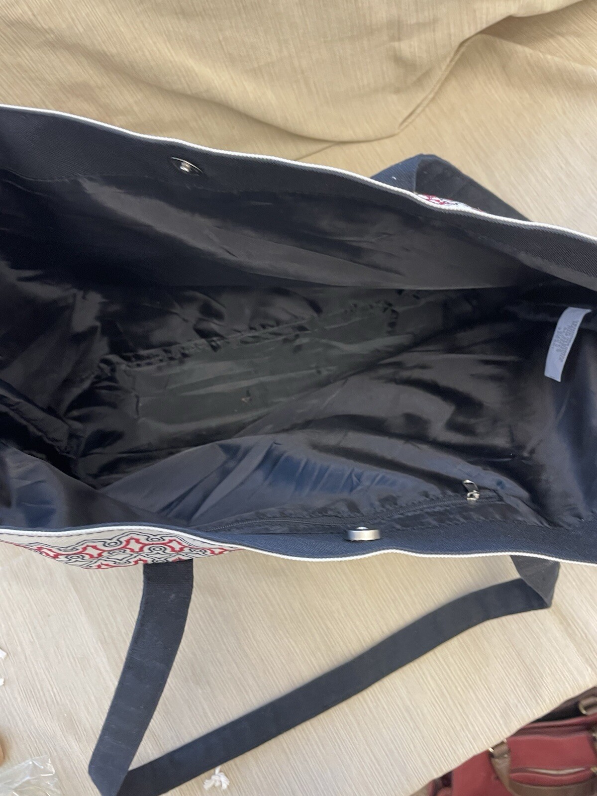 This is a medium-sized tote bag for women, with a cream canvas exterior featuring a black floral design and red and black stitching Aztec pattern. It has a snap closure, black nylon lining, silver hardware, and black canvas handles. The bag is 20 inches in length, 12 inches in height, and 5 inches in width, with a depth of 12 inches. The style is a tote bag perfect for carrying essentials in a fashionable way.
